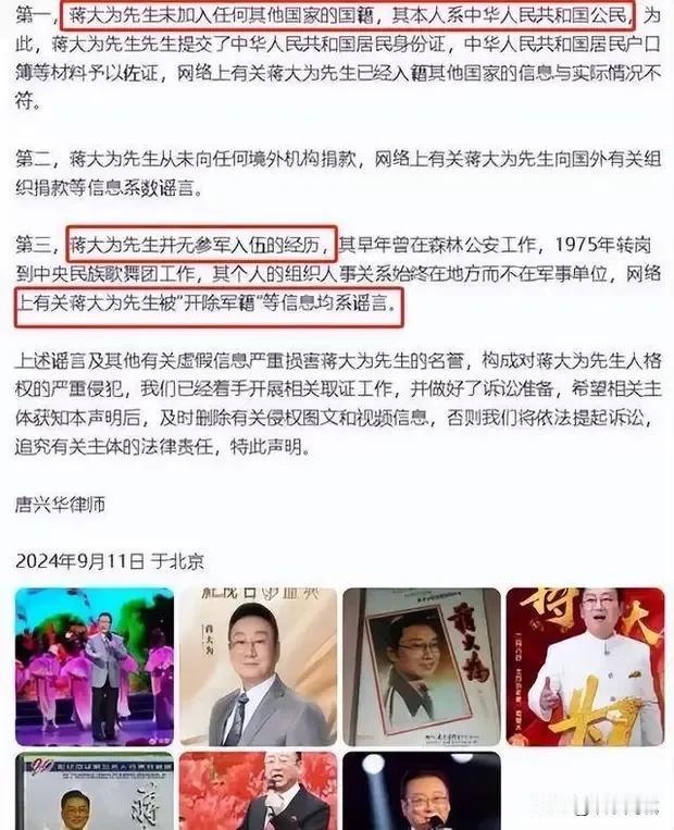 蒋大为:谣言风暴中坚守艺术与清白的歌者 在中国音乐史上,蒋大为堪称传奇。一首《敢问路在何方》,让他火遍大江南北,成为央视春晚常客,被赞为中国20世纪最有影响力的音乐家之一。然而,近年来,他却深陷负面新闻漩涡,移民、骗财骗色、开除军籍等谣言甚嚣尘上,这位老艺术家差点晚节不保。 90年代末,蒋大为全家迁居加拿大,一时间“不爱国”“国内捞够钱去国外享受”的指责铺天盖地。实则,他是为陪女儿蒋怡读书,抵押北京房产,到加拿大后生活艰难,为供女儿读书回国“打工”还债,一年接138场商演。14年后他公开解释,绿卡早已失效,自己始终是中国人。 2003年,“骗财骗色”的指控又将蒋大为推上风口浪尖。女经纪人姚曼手持欠条控诉他欠债不还。原来,姚曼担任其经纪人时多次克扣报酬,蒋大为解除合约后,姚曼伙同他人非法拘禁他并逼写欠条。法庭上,蒋大为以出国演出记录证明欠条伪造,姚曼等人因敲诈勒索罪获刑。 2024年,“被开除军籍”的谣言又起。实际上,蒋大为早年虽在文艺团体,但从未有军籍,网上“军装照”是文工团演出服。他离开文工团是出于个人职业规划,并非因道德问题。 从“移民叛国”到“骗财骗色”,再到“被开除军籍”,蒋大为在谣言中艰难前行,却始终用事实和证据捍卫清白。这也让我们看到,网络传言的浮躁与不实,而真正的艺术家,终会在岁月中闪耀光芒。 蒋大为的唱歌水平怎么样