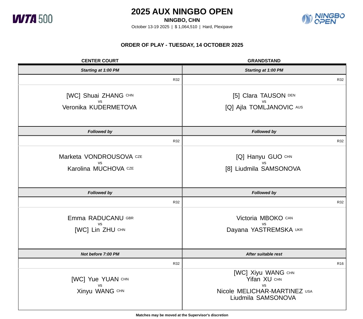 2025奥克斯·宁波网球公开赛今日赛程📅