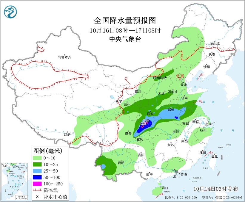 10月14日08时至15日08时,新疆沿天山地区、内蒙古东部、吉林西部、黑龙江南部等地有小到中雪或雨夹雪,局地大到暴雪;黄淮南部、江汉西部和北部、西南地区东部、华南西部、海南岛西部等地部分地区有中到大雨,其中,重庆东北部等地局地有暴雨(50~70毫米)(见图1)。