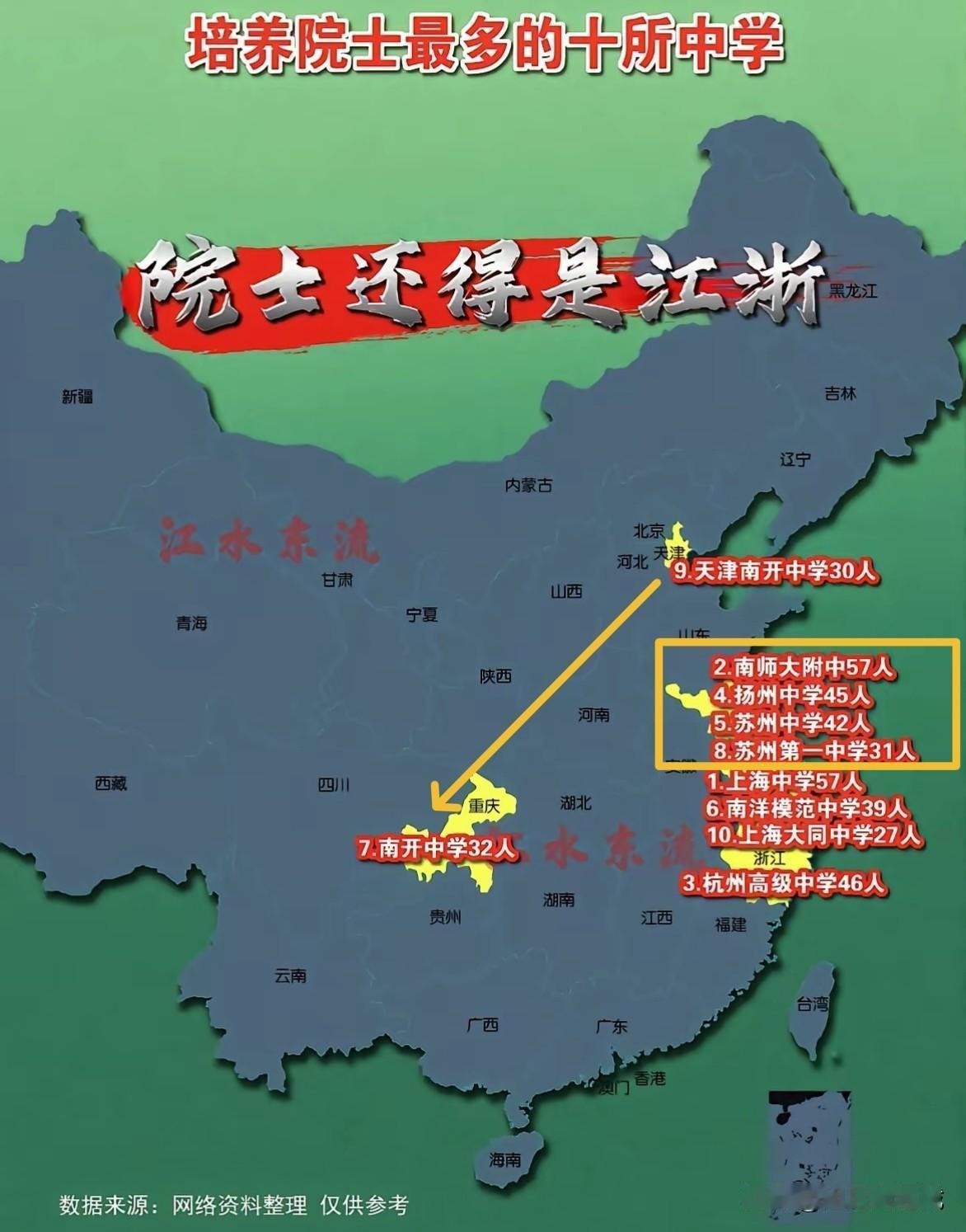 培养院士最多的高中,还是南师附中!扬州中学第二,南通未有上榜? 全国培养院士最多的十所高中,江浙沪占了八席。其中,南京的南师附中并列第一,有57人!令人意外的是,扬州中学排名第二,也有45人。然而,近几年扬州的高考成绩却远不尽如人意,看来衰落较快。 苏州则是有两所学校上榜,老牌的苏州中学有42人,还有一个苏州第一中学也有31人。一座普通地级市,两所高中上榜,实属厉害! 剩下的两所都是南开中学。没有想到,南开中学居然是在重庆,而北边的那个叫天津南开中学。这个还是比较有意思的,或许也是因为一些历史时代的变迁导致的吧。 南通作为传统的教育之乡,虽然说南通籍的院士数量是比较多的,但是在这个高中方面却没有一所学校入榜,算是一件比较遗憾的事儿吧。高考成绩也许和高级人才的培养关系并不是特别的大。