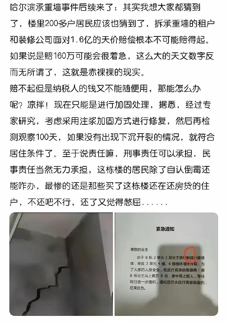 真是不涨记性。还记得哈尔滨那个挖承重墙案件吗?拆承重墙的住户和装修公司面对的是1.6亿的天价赔偿,谁赔得起呢。最后还是200住户承担了所有,只能加强修复。 这种事一而再再而三发生,有些人就是无知或是知法犯法,为了一已私利而将邻居的利益抛诸脑后,可恨可气!这么大动静,物业的管理责任又在哪里? 这事吧,大概率最后还是政府出手,协商赔点钱,修复完事。 那些自大自私的人,真的不要手欠! 必须让他付出涨记性的代价!!