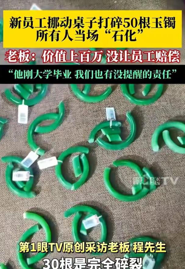 江苏苏州一家公司内发生了一起令人心惊的意外。一名刚大学毕业的新员工,在挪动办公桌时,不慎将桌上摆放的一套共计50根玉镯碰落在地。顷刻间,清脆的碎裂声不绝于耳,现场所有人都被这突如其来的状况惊得当场“石化”,呆立当场。 据农视网10月14日报道,在江苏苏州,一家刚开业不久的玉器店里,一名刚大学毕业的新店员,因为挪动一张摆放玉器的桌子,不小心把桌上的玉镯全摔在了地上,损失着实不小。 那天,程先生为了配合店里的视频拍摄,让这名新店员帮忙挪动一张放着玉镯的桌子。 这名年轻人刚出校门,到店里上班没几天,没什么职场经验,挪动桌子的时候,压根没注意到桌缝之间还摆着一整盘玉镯。 就这么轻轻一挪,那盘玉镯顺着桌沿滑了下来,“哗啦”一声砸在地上. 店里的地面没铺地毯,硬得很,玉镯一碰到地面就碎了,清脆的碎裂声一下子让店里所有人都僵住了,没人敢出声。 新店员当场就慌了神,站在原地手足无措,心里直打鼓:看这玉镯的样子就不便宜,真要让自己赔,肯定拿不出钱。 等大家反应过来,一起清点碎掉的玉镯时,才发现情况比想象中更严重。 原本整整50根玉镯,有30根碎得彻底,根本没办法修复。 后来才知道,这些玉镯不全是一种材质,有和田碧玉的,也有白玉的,算下来总价值超过了一百万元。 这事发生后,不少人都在琢磨,责任到底该算在谁头上。 其实仔细想想,不能简单怪到新店员一个人身上。 程先生当时是主动让员工帮忙挪桌子的,可他没提前跟员工说清楚,这桌上的玉镯有多贵重,也没教员工该怎么小心操作才能不碰到这些易碎品,这是事前提醒和培训没做到位。 而且,这家新店刚开,地面连块地毯都没铺,就算玉镯只是轻微滑落,也没有任何缓冲的余地,从场地防护来看,确实考虑得不周全。 再看那名新店员,他刚步入社会,既没有玉器行业的工作经验,也不熟悉店里物品的摆放情况,没注意到桌缝里的玉镯,更多是经验不足导致的疏忽,并不是故意要损坏东西。 更现实的是,就算真要他承担赔偿责任,百万级别的金额,对一个刚毕业、还没稳定收入的年轻人来说,根本就是无力承受的负担,就算让他承担一半,也不是一笔小数目。 让人意外的是,老板程先生知道损失后,没有对着新店员发火,也没有提赔偿的事。 他只是愣了一下,随后让员工一起帮忙清点碎玉镯,冷静得超出所有人的预期。 清点完之后,程先生明确说,不用员工赔这笔钱,损失由自己承担。 他觉得事情已经发生了,再纠结“谁对谁错”也改变不了结果,不如把碎掉的玉镯收拾好,当成两个人都要记住的教训,还特意提醒新店员,以后做事要更沉稳,多留意身边的细节。 新店员原本以为会挨一顿狠骂,甚至可能丢工作,见程先生不仅没追责,还耐心提醒自己,心里的石头才算落了地。 之后他也确实记取了教训,做事比之前细心了不少,再也不敢像刚开始那样毛躁。 其实程先生最难得的地方,不在于他承担了百万损失,而在于他没有把自己管理上的疏忽,转嫁给毫无还手之力的新员工。 刚入社会的年轻人,本来就处在适应期,对职场规则、工作风险都不熟悉,要是真让他扛下这笔巨额损失,很可能会把人逼到绝境。 程先生的选择,没让一场意外变成年轻人的“职场噩梦”,反而给职场留了份难得的温暖。 今天的分享到这里就结束了,大家对此事有何看法,欢迎在评论区留言和讨论,感兴趣的可以点击头像加关注,我将每日更新优质内容,我们下期见。 信源: 原文登载于农视网2025年10月14日关于《员工拉桌子不慎摔碎约50根玉镯,店主:没有让他承担任何赔偿》的报道