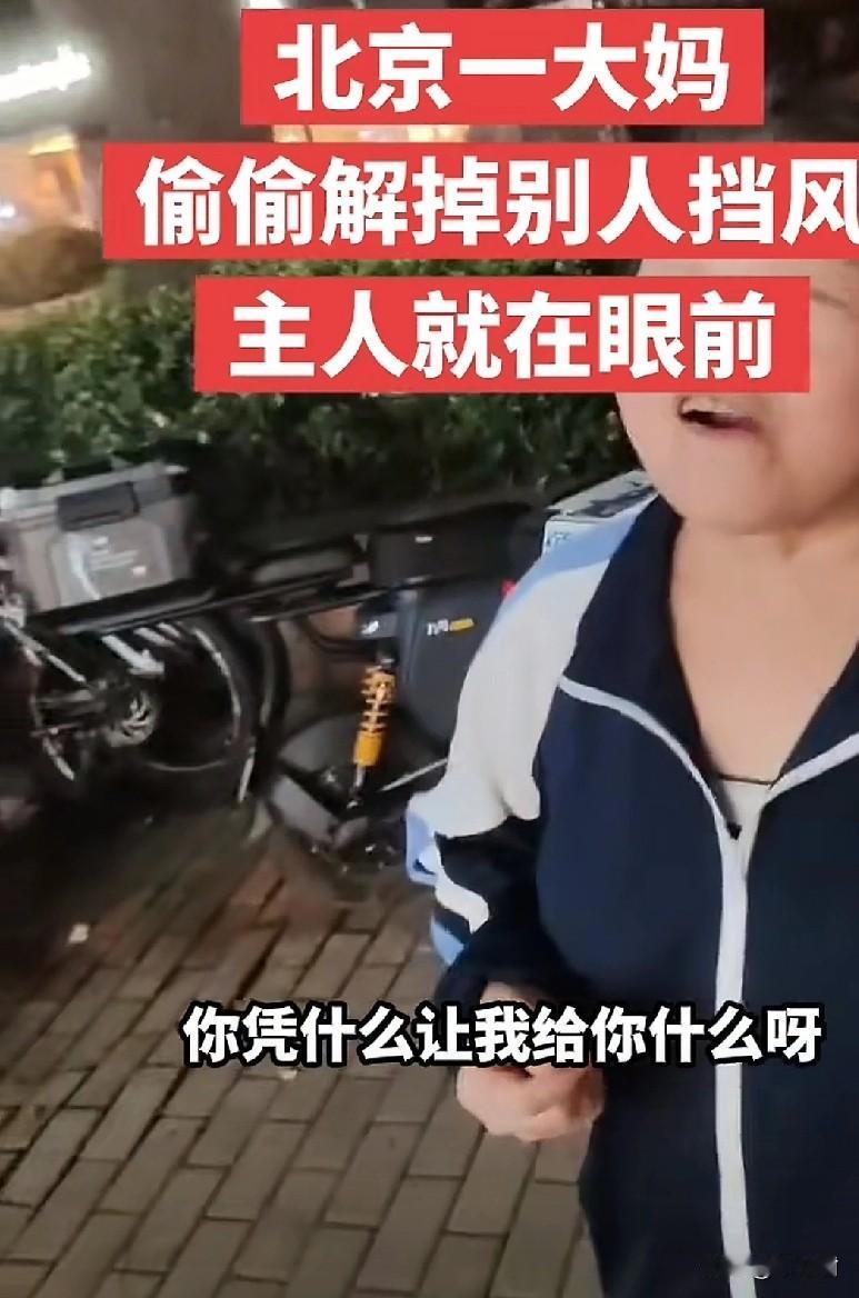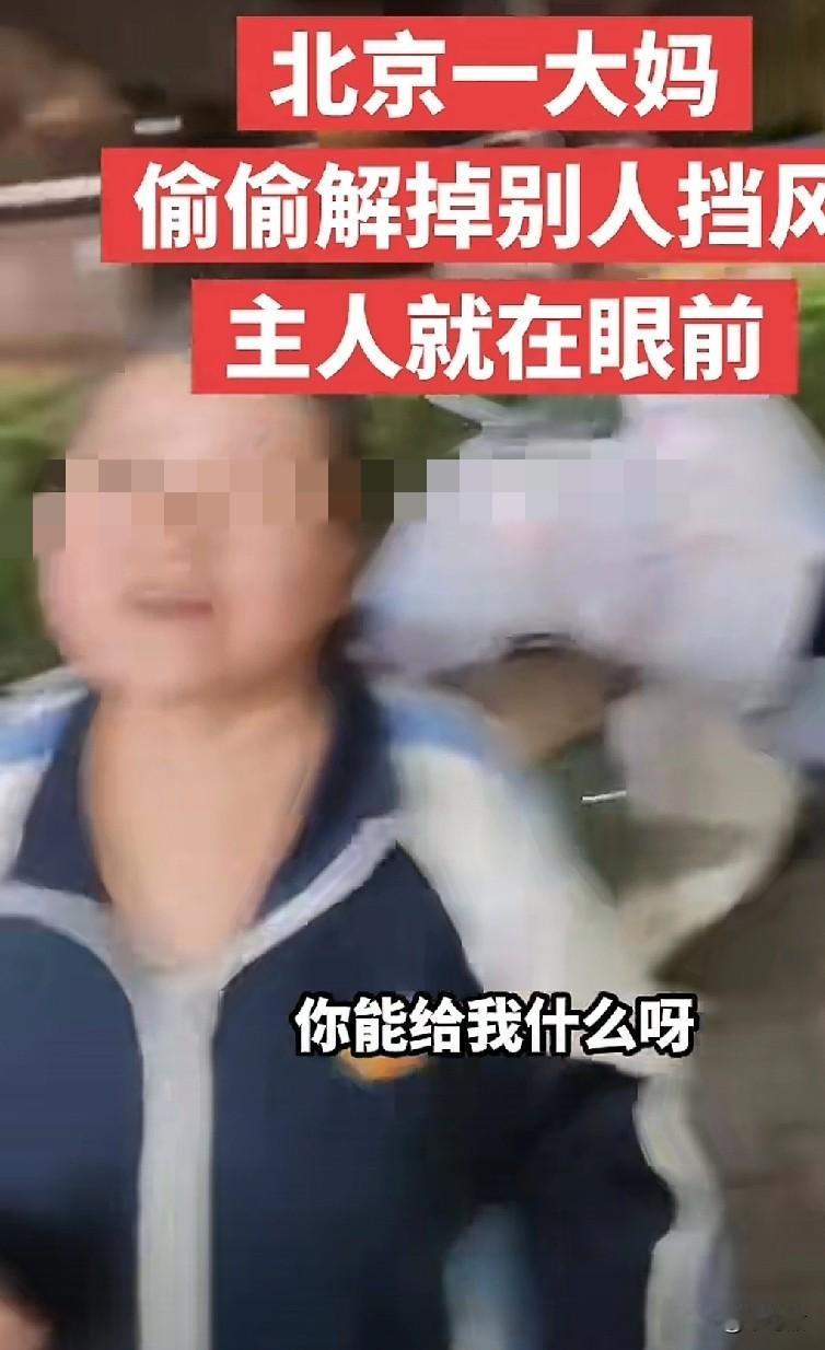 真是笑不活了啊,北京啊,大城市啊,也有这样的刁民了啊。 近日一女子看到一大妈肆无忌惮的,就在解掉自己小车的挡风被,这是学“零元购”啊,喜欢什么,看到什么,就可以自己动手丰衣足食了吗? 面对小车主人的质问,没想到这大妈一点不含蓄,稍微尴尬了那么一秒钟,还跑去质问女子,这是你的吗?和着还要确认一下,是不是要继续下去啊? 女子说“你不管是不是我的,你也不能偷拿别人东西啊”,这份不肯定,反而助长了大妈的嚣张气焰啊,反手问女子,“那你能给我什么啊?” 女子一瞬间被气到,你偷拿我的东西,被我发现没拿到,反过来还要问,还能给其他吗?和着别人该欠你的吗? 天啊,这世界还有这样的人啊,别说车主人要生气,我刷到这样的人,我也跟着生气,怎么真有这样的人啊?? (图片来自网络视频)