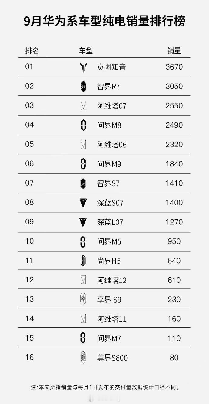 9月“华为系”“纯电”销量排行榜,岚图知音卖了不少诶。[哆啦A梦吃惊]新能源汽车
