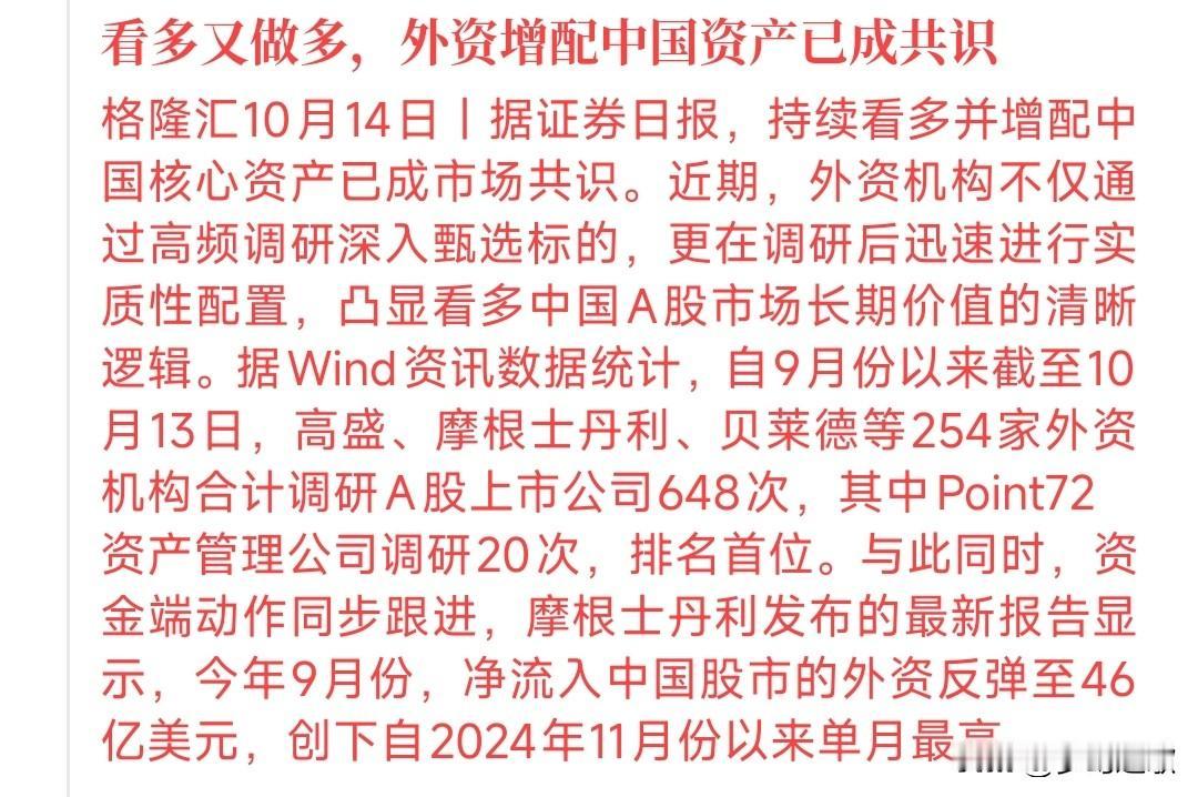 外资增配中国资产,中国资产吸引力持续增加 现在很多外资几乎已经达成了默契的共识,纷纷加入增配中国资产的大军,仅仅9月就增加了46亿美元,比8月又增加了14亿美元。 主要原因就是中国资产的估值一直处于低位,即使涨了20%,也依然处于低估值空间,预示着中国资产的上升空间很大。 随着世界经济的恢复,中国经济再次以5%以上的增速增长,要知道中国的经济体量排名第二,5%的增速完全就是高增速,摩根士丹利,贝莱德之流也看到了这点,再低点大量购买也是理所当然的。