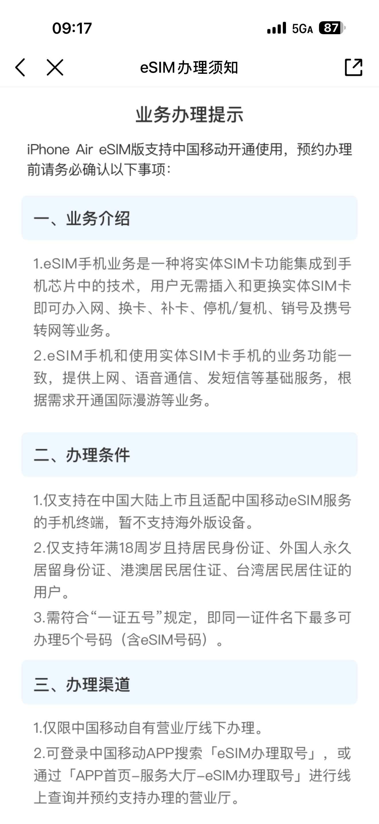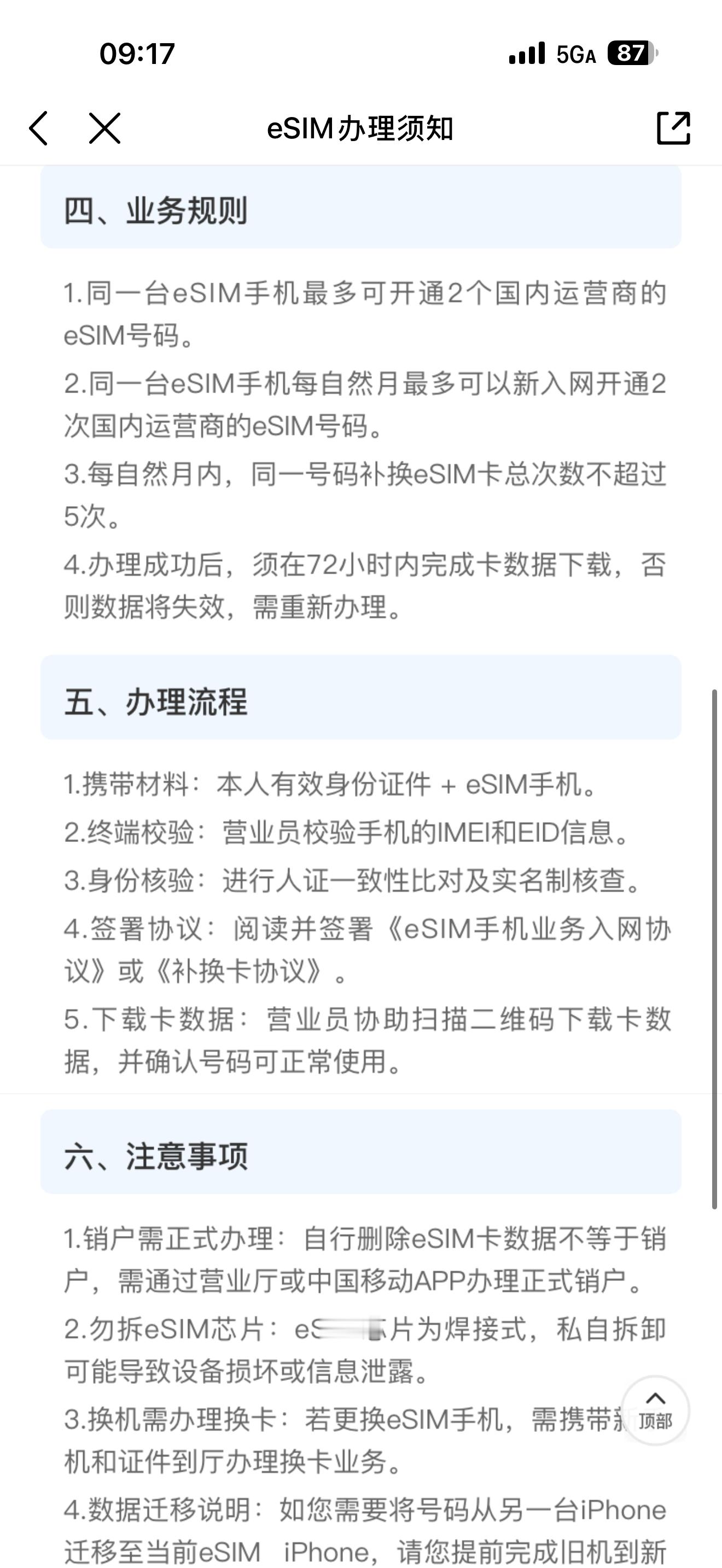 1.仅支持去线下移动营业厅办理(说实话有点脱离eSIM的本意了[允悲],但是至少现在支持了,可能还考虑到诈骗的风险,所以这一块估计只能慢慢推进了);