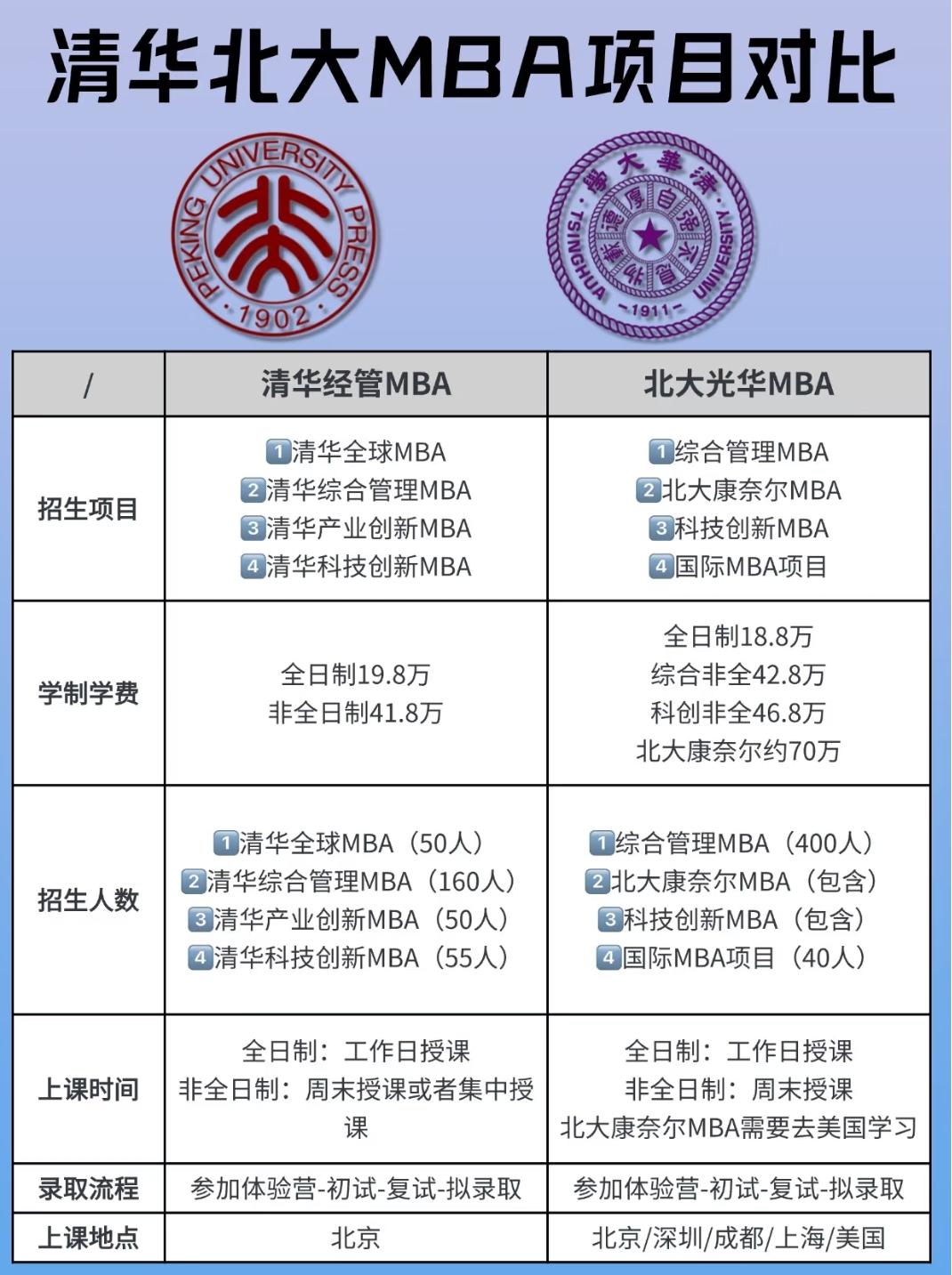 清华北大MBA项目深度对比,职场人深造该怎么选? 打算读MBA的职场人,清华经管和北大光华这两大顶流项目,是不是让你纠结得很?今天咱们就把它们掰开揉碎了聊聊,从项目设置、学费、招生人数到上课方式,给你整得明明白白。 先看招生项目。清华经管MBA有四个方向:全球MBA、综合管理MBA、产业创新MBA、科技创新MBA。全球MBA主打国际化,学生能接触大量国际资源;综合管理是经典方向,培养全能管理人才;产业创新和科技创新则紧扣当下产业升级和科技发展的趋势,针对性很强。 北大光华MBA也有四个项目:综合管理MBA、北大康奈尔MBA、科技创新MBA、国际MBA项目。综合管理同样是基础且全面的方向;北大康奈尔MBA是和美国康奈尔大学的合作项目,含金量很高;科技创新MBA聚焦科技领域的管理人才培养;国际MBA项目则为有国际视野的学生提供了更多选择。 学费方面,清华经管全日制19.8万,非全日制41.8万。北大光华全日制18.8万,综合非全42.8万,科创非全46.8万,北大康奈尔约70万。这么一看,北大康奈尔的学费确实不低,但它的国际资源和双学位也是很诱人的。 招生人数上,清华全球MBA招50人,综合管理MBA招160人,产业创新MBA招50人,科技创新MBA招55人。北大综合管理MBA招400人,北大康奈尔、科技创新MBA包含在其中,国际MBA项目招40人。清华的招生规模相对小一些,竞争可能更激烈;北大综合管理招的人多,机会也多些。 上课时间和地点也得考虑。清华全日制是工作日授课,非全日制是周末或集中授课,上课地点都在北京。北大全日制也是工作日授课,非全日制周末授课,北大康奈尔需要去美国学习,上课地点有北京、深圳、成都、上海、美国。要是你经常在南方或者想去美国深造,北大的地域选择更灵活。 录取流程两者差不多,都是体验营-初试-复试-拟录取。这意味着你得先过体验营这关,再准备初试复试,过程挺考验人的。 说到底,选清华还是北大,得结合自己的职业规划、经济实力和生活需求。要是你想在科技或产业创新领域深耕,清华的相关项目很对口;要是你看重国际合作或者想去深圳、成都发展,北大可能更合适。 对于正在考虑读MBA的你,是更倾向于清华的工科底蕴+商科创新,还是北大的人文氛围+国际资源呢?MBA排名 mba学历 mba申请经验 企业MBA mba报名流程 embamba 国内mba排名