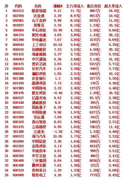 10月14日开盘45分钟,主力资金“买入的 ”的35名单一览! 隆基绿能:主力净流入11.7亿元。 比亚迪:主力净流入8.97亿元。 山子高科:主力净流入8.55亿元。 英维克:主力净流入6.15亿元。 中石科技:主力净流入4.25亿元。