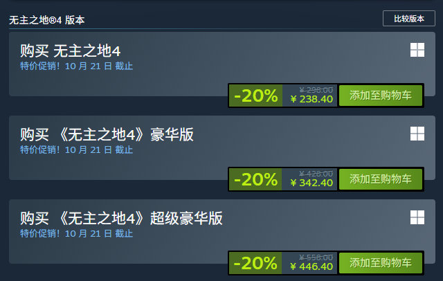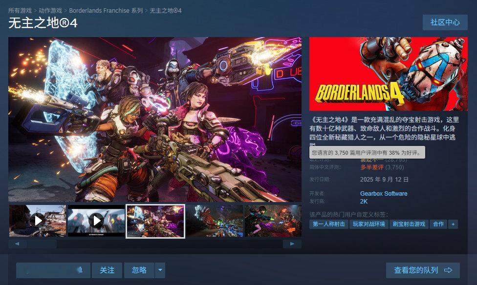 夺宝射击游戏《无主之地4》首次打折,标准版折后238.4元,豪华版折后342.4元,超级豪华版446.4元,10月21日截止,支持中文。本作目前简中好评率为38%,“多半差评”,收录3750篇玩家评测,给差评的玩家主要对游戏糟糕的优化不满。Steam 无主之地4
