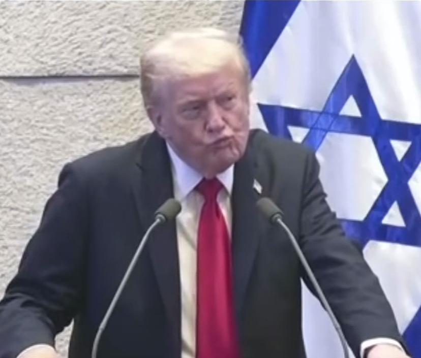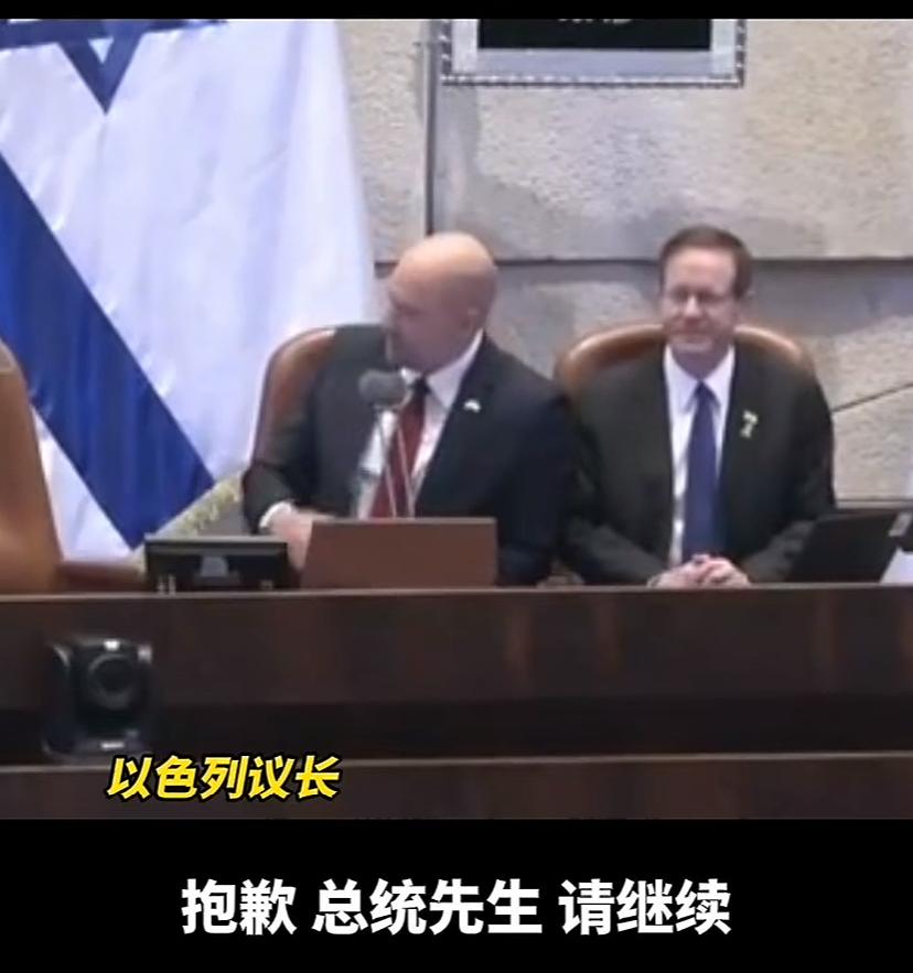 把川普整不会了,表情惊愕,嘴吸着感叹现场这么混乱。 川普在以色列议会大厅发表演讲