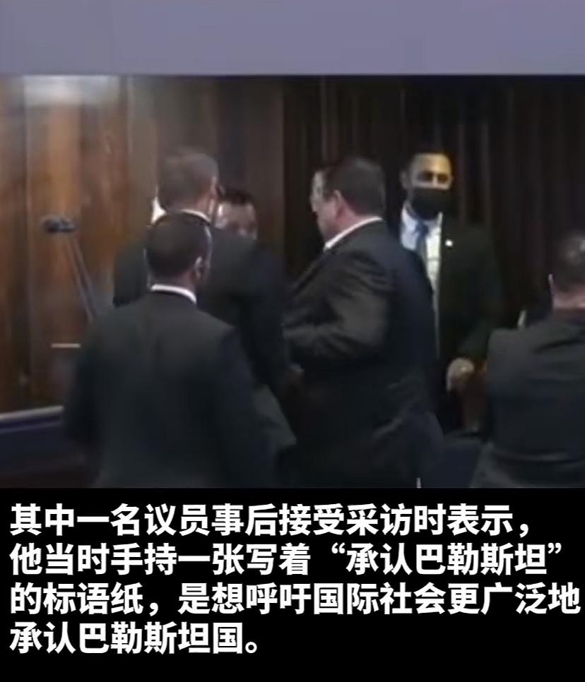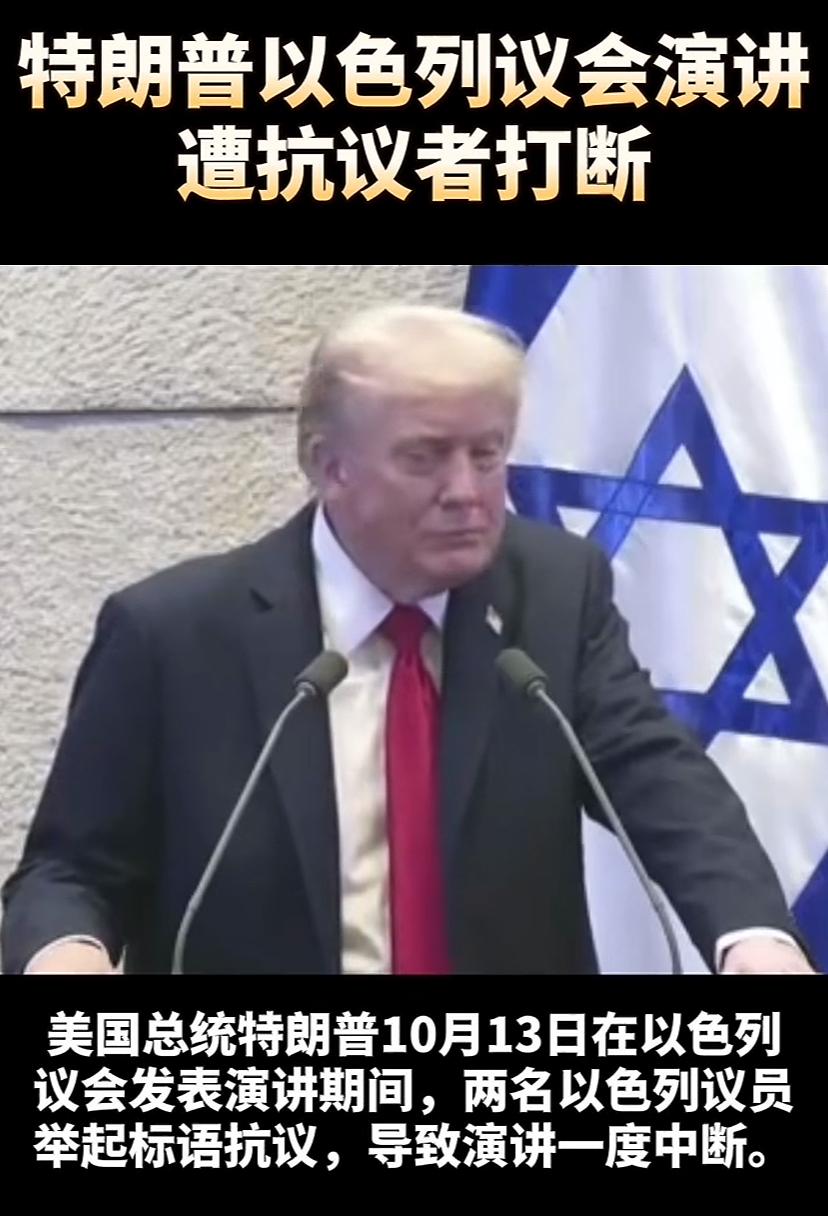 把川普整不会了,表情惊愕,嘴吸着感叹现场这么混乱。 川普在以色列议会大厅发表演讲,突然两名议员举起标语表达意见,工作人员很快稳定了秩序。议长随后说:请您继续演讲。川普稳过神来之后,淡定的说,你们处理的太高效了。