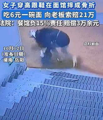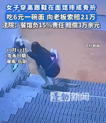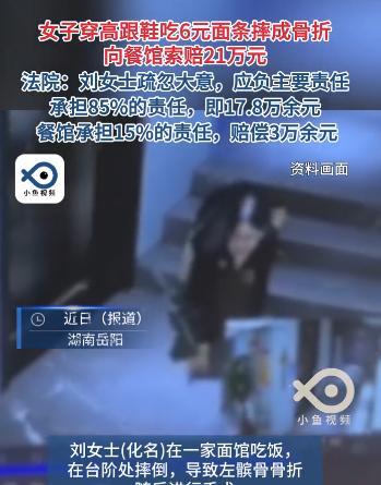 “锅从天降!”湖南,一女子在餐馆,花6块点了碗面,岂料在起身时,高跟鞋踢到门台阶摔倒,造成左腿骨折住院,事后,女子认为是餐馆没做好安全措施,要求对方赔偿21万,而法院判决令人意外! 一碗6块钱的素面,本是寻常日子里的简单一餐,却没想到成了湖南岳阳王女士人生里的一道坎。 要说这事儿的起因,实在普通得不能再普通。 今年上半年的一个下午,王女士像往常一样走进家附近的小面馆,点了份常吃的素面,扫码付了6块钱。 她端着面碗往熟悉的靠窗座位走,可不知怎么,刚迈上台阶,高跟鞋的细跟突然卡在了台阶边缘的缝隙里。 “咔嗒”一声脆响还没落地,王女士整个人已经失去平衡往前扑去。 膝盖重重磕在冰凉的瓷砖上,一阵钻心的疼让她当场喊出了声,手里的面碗摔在地上,热汤溅湿了裤脚。 周围食客赶紧围过来,老板也慌了神,一边扶她一边喊人打120,混乱中谁也没留意台阶上是否有汤汁残留。 送到医院检查,结果让王女士倒吸一口凉气:左髌骨粉碎性骨折,必须马上手术。 术后躺在病床上,看着腿上厚厚的石膏,她越想越委屈。 出院后做的司法鉴定更让她揪心,左膝关节功能丧失30%,构成十级伤残。 医生建议伤后休养180天,还需要90天的专人护理和60天的营养补充。 前期手术费花了近5万,加上误工费、护理费,一笔笔开销压得她喘不过气,她觉得这事儿不该自己全扛。 台阶那么高,又没贴个提醒,店里人多手杂难免有汤渍,这不是安全隐患吗? 王女士找到面馆老板,提出了21万元的赔偿要求。 可老板一听就急了,指着台阶辩解,这台阶从开店就有,特意贴了防滑砖。 而且当天早上刚拖过地,干干净净的,之前从来没人摔过。 你穿那么高的高跟鞋,走路不看脚下,怎么能赖店里? 双方各执一词,王女士只好一纸诉状把面馆告上了华容县法院。 法院开庭时,双方的说法针尖对麦芒。 法官调取了面馆的监控,画面里的细节很清晰:王女士走路时一直低头看着手机,穿的5厘米细跟凉鞋本就不稳。 经过台阶时既没放慢脚步,也没抬头看路,完全没留意脚下的情况。 结合这些证据,法院的判决给出了明确说法。 王女士作为完全民事行为能力人,又是常客,对台阶情况本该熟悉,却穿高跟鞋玩手机疏忽大意,得承担85%的主要责任。 餐馆虽然做了防滑处理,但没贴警示标识,台阶也存在轻微安全隐患,要负15%的次要责任,赔偿31503.15元。 一审结束后,双方都没上诉,判决已经生效。 这事儿传到网上,议论声一下子涌了出来。 有人说王女士是狮子大开口,6块钱的面想换21万赔偿,太不地道。 也有人觉得餐馆有点冤,都做了防滑还得赔钱。 回头再看这起“6元面引发的索赔案”,21万的诉求没被支持,3万多的赔偿也算不上“天价”,法院的判决其实是在平衡双方的权益。 但比判决更重要的,是这事儿给所有人提的醒:商家多一分细心,消费者多一分留意,很多“锅从天降”的意外其实都能避免。 毕竟,我们去餐馆吃的是热乎饭,盼的是踏实平安。 让“预防”替代“事后追责”成为主流,减少“锅从天降”式意外争议,才是这起案子最该留下的启示。 信息来源:潇湘晨报2025-10-12发布:湖南一女子吃6元面条,穿高跟鞋回座位脚滑摔成十级残伤,引发21万元索赔,法院判了:餐馆负15%责任