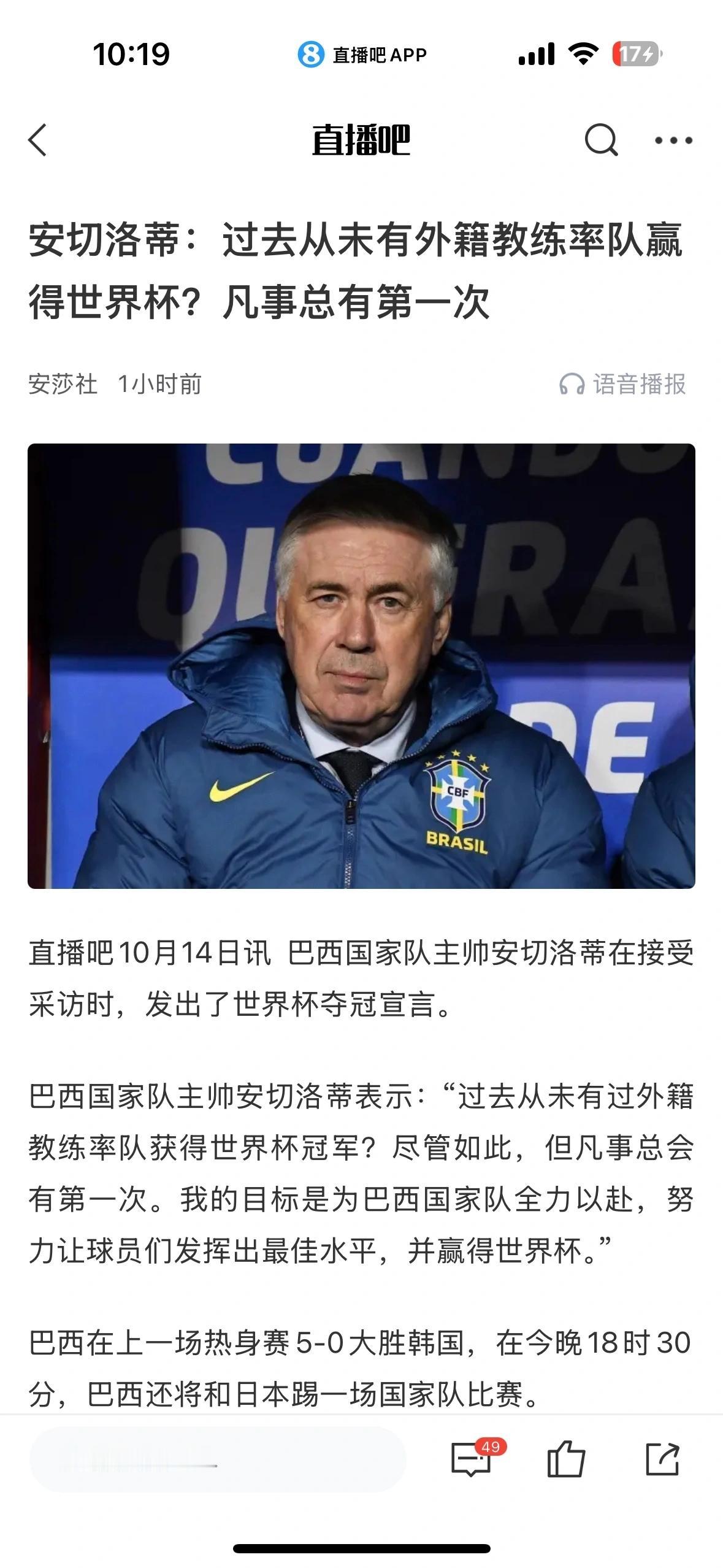 安切洛蒂开始畅想世界杯冠军了! 巴西有5次世界杯冠军,都是巴西籍主教练。 目前几场下来,我感觉安切洛蒂的巴西脱胎换骨,说不定明年有机会呢。 历史最佳教练,弗格森,瓜迪奥拉都是佼佼者,安切洛蒂如果拿世界杯,那就是历史第一教练! 梅西拿到世界杯封神,安切洛蒂也想。[大金牙]