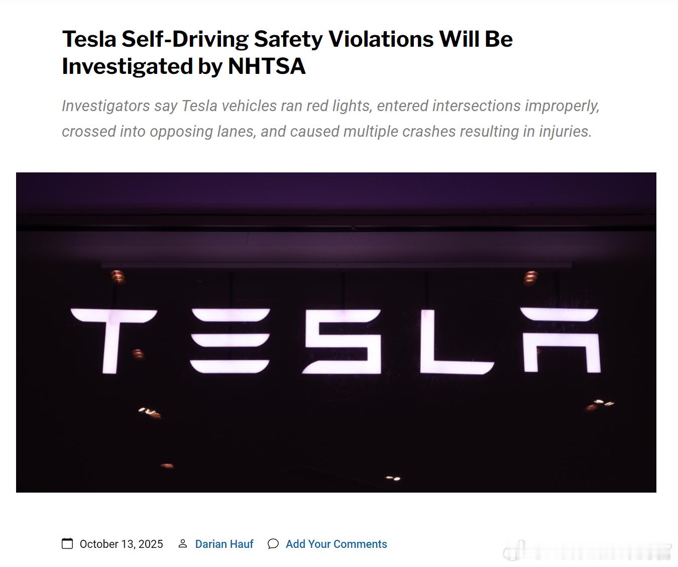 美国国家公路交通安全管理局(NHTSA)也于10月7日再次启动了对特斯拉的调查,主要问题是FSD在过路口时会出现闯红灯或者不按规定让行等BUG。