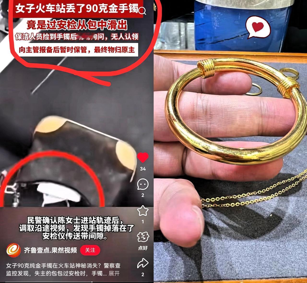 近日,陈女子在南京火车站过安检时! 也太大意了,90克的金手镯随便往没拉拉链的包里一塞,过安检时滑进 传送带缝隙都没察觉,直到两天后才发现丢了,好在她运气爆棚,保洁大姐捡到后妥善保管,民警还带着辅警熬了十几个小时看监控,硬是从48小时的录像里揪出了线索。 这事看着是圆满结局,但藏着个特坑人的误区——好多人觉得戴金饰过安检会麻烦,其实完全是想多了。 黄金是金属,安检门确实可能响,但工作人员一看是首饰根本不会拦你,压根不用摘下来单独放。比起安检响一下的小尴尬,把贵重物品随手丢包里才是真冒险。 要是遇到的不是拾金不昧的保洁,这近十万的手镯恐怕就找不回来了。 你过安检时会把首饰摘下来单独放吗?有没有过类似的粗心时刻?