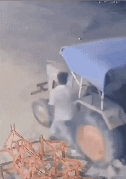 说他不幸吧,他又是幸运的,正常人思路应该站不起来才对 都说做事得细心,不能马虎,有些事你马虎点可能无关紧要,可有些事你一旦马虎了命可能就交代在那了。 视频中一哥们,农用拖拉机处于启动状态,可能没带刹车,拖拉机就往前跑了,可能是车速不快,小伙也小散步的想追上去把车停下来,可能轴距太短,惊人的一幕出现了,由于小伙走路速度跟不上车速,脚后跟让后轮给碾到了,后车轮在他整个人身上压了遍,注意了一只大腿还是弯着的,可是谁又能想到,小伙还是豪发无损的站起来追上拖拉机把车停下来。 这就有点不懂了,小伙到底有没有受伤,有受伤为什么还有完成这一套动作,不会是回光返照吧?你们觉得呢