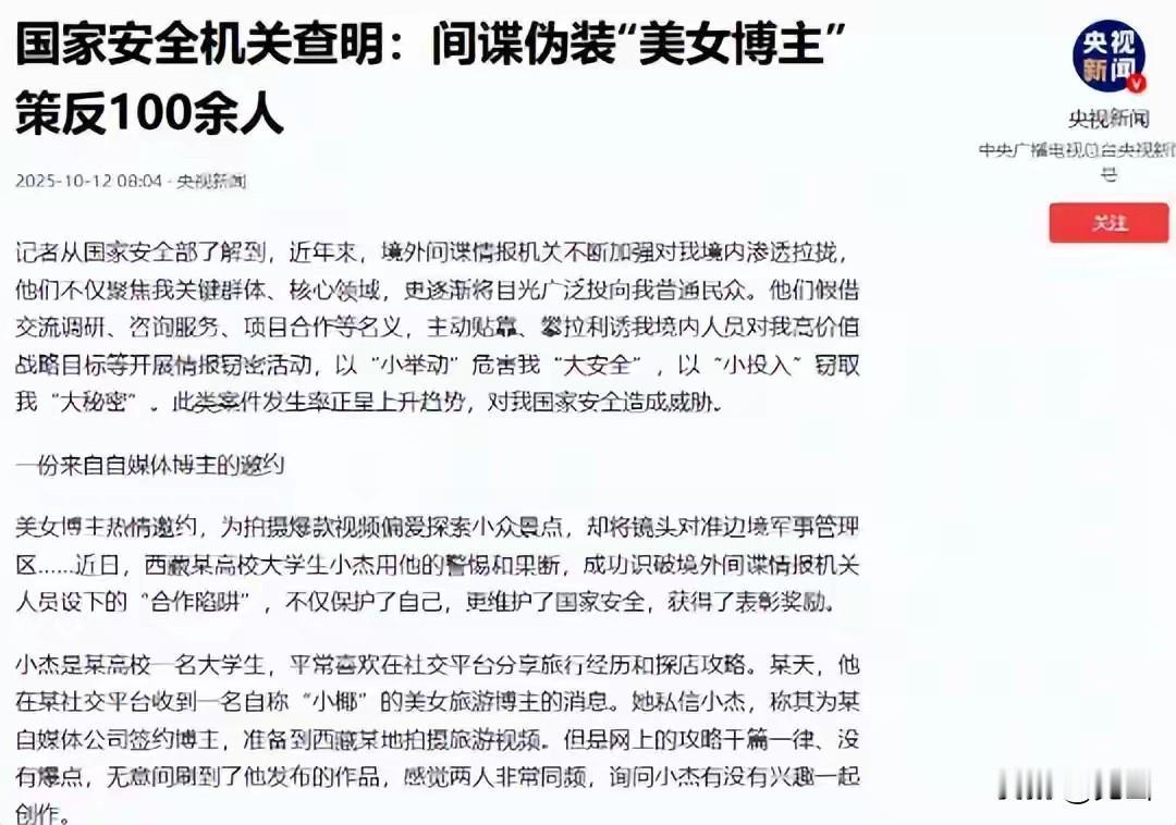 刚刷到新闻 央视曝光的女间谍 作案手段隐蔽阴险,她不是靠强硬手段,而是 装成“美女博主”“网贷经理”,用虚拟定位勾搭军事单位周边的人,接着用金钱诱惑、情感拉拢来突破对方心理防线 她专挑退役军人、业内人士下手,从航展照片开始,一点点套取军事部署等涉密资料,让对方警惕性一步步降低。这些细节都是国家安全机关权威披露的,不是瞎编的 真是细思极恐,间谍活动离我们并不远 我觉得,任何看着像“天上掉馅饼”的邀约,都可能藏着陷阱 守住保密底线,就是守护国家安全
