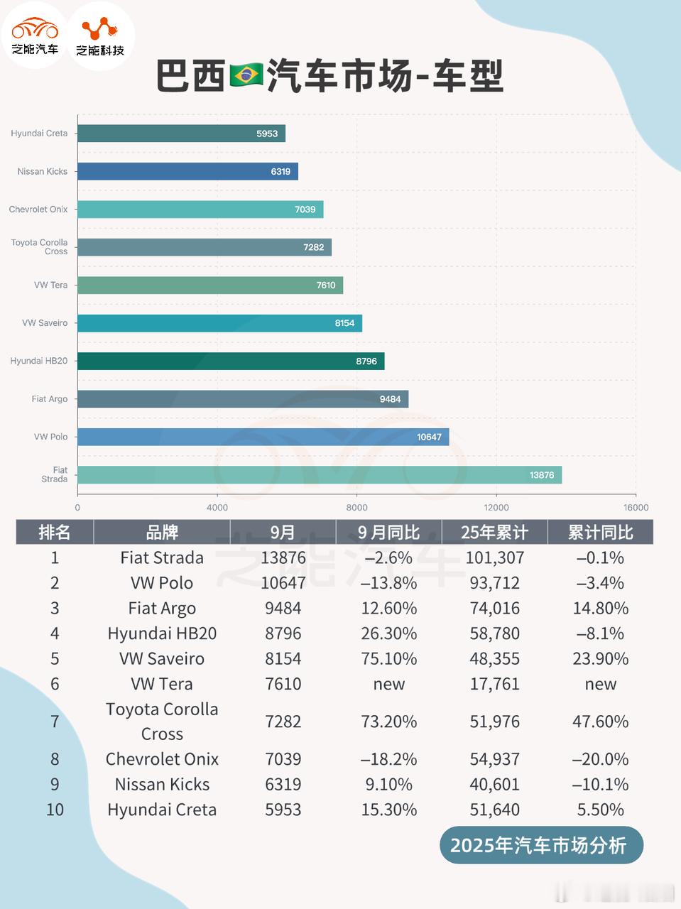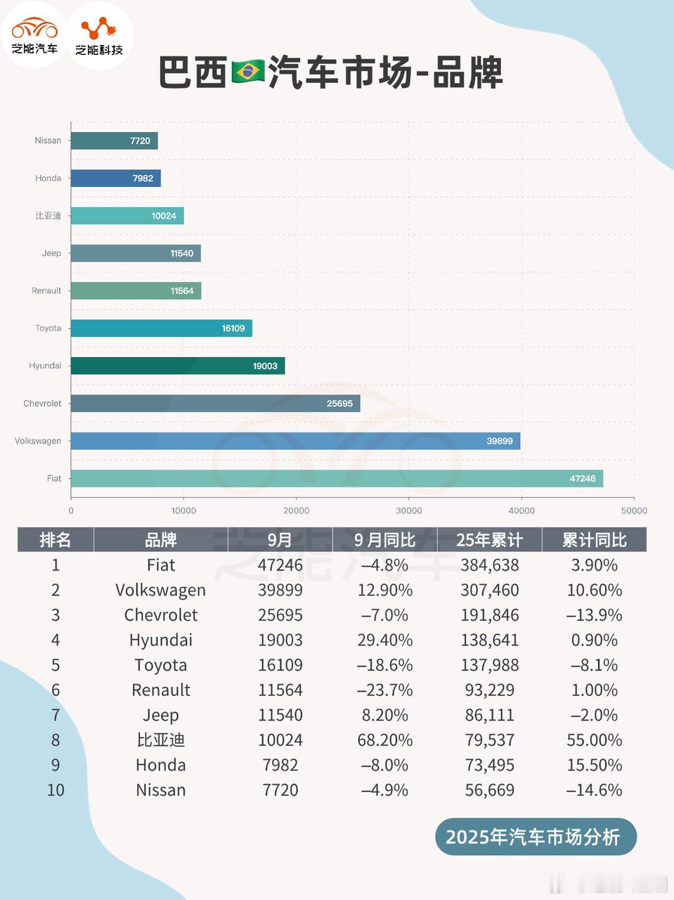 2025 年 9 月巴西车市总体稳定,单月销量微降但累计销量创近年同期最佳。