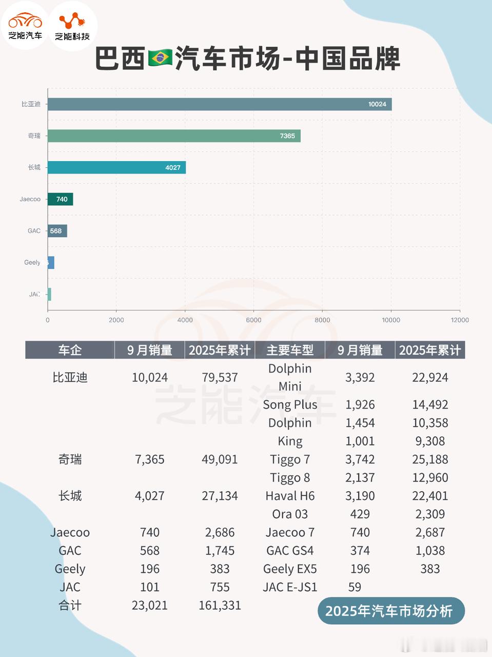 中国品牌成核心增长力量,单月销量可观,比亚迪、长城、奇瑞均大幅增长,部分车型已获市场认可。SUV 在巴西市场持续占据主导地位。