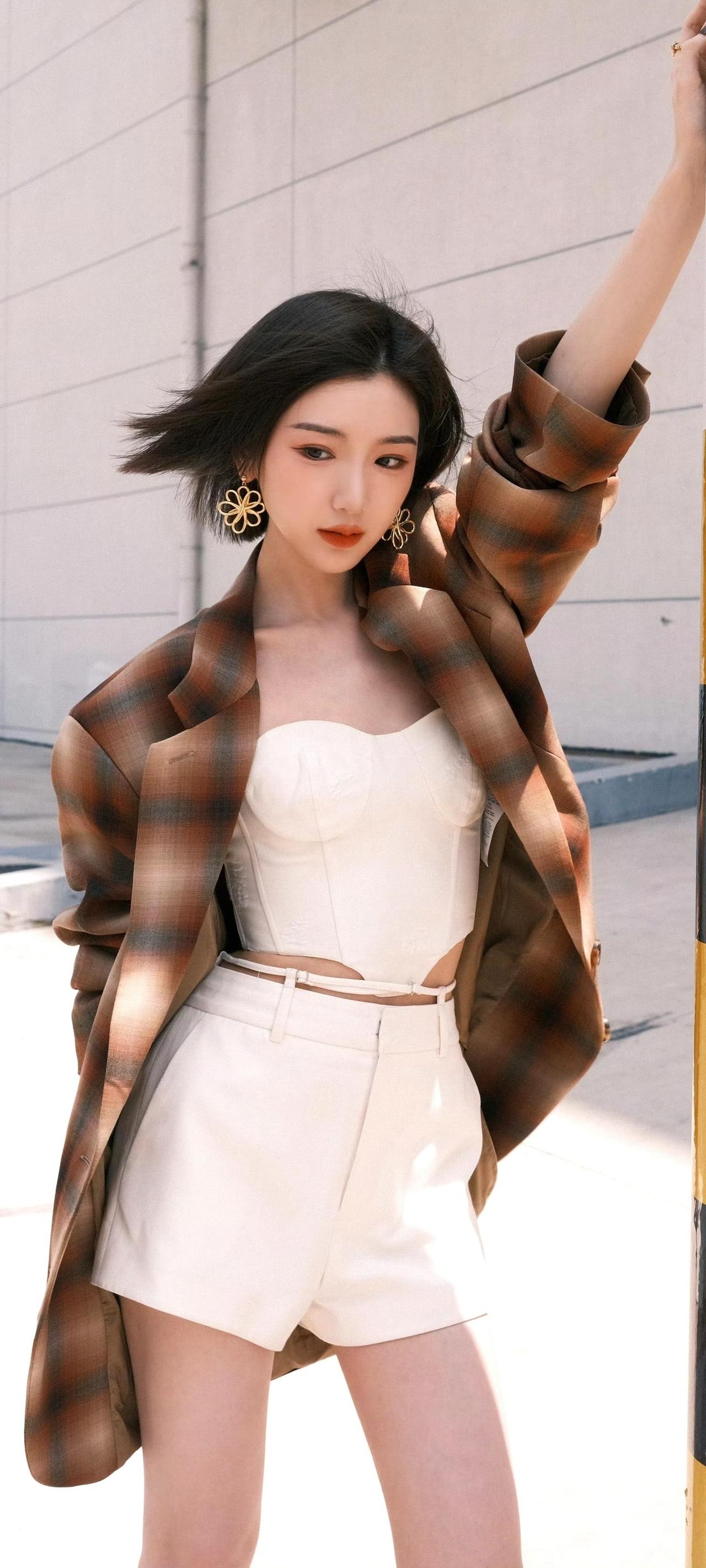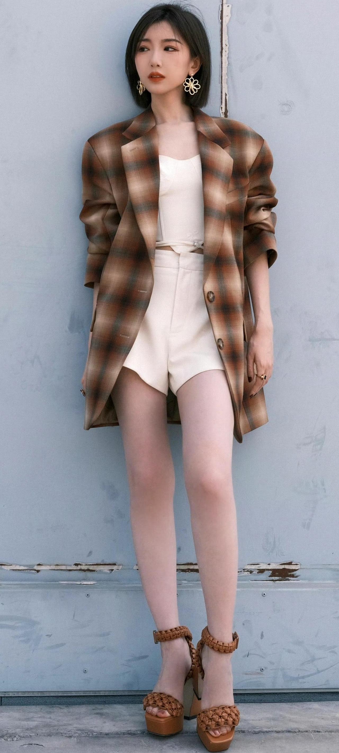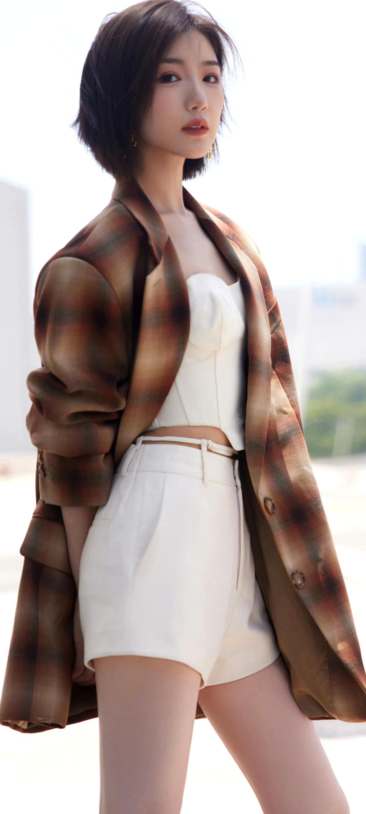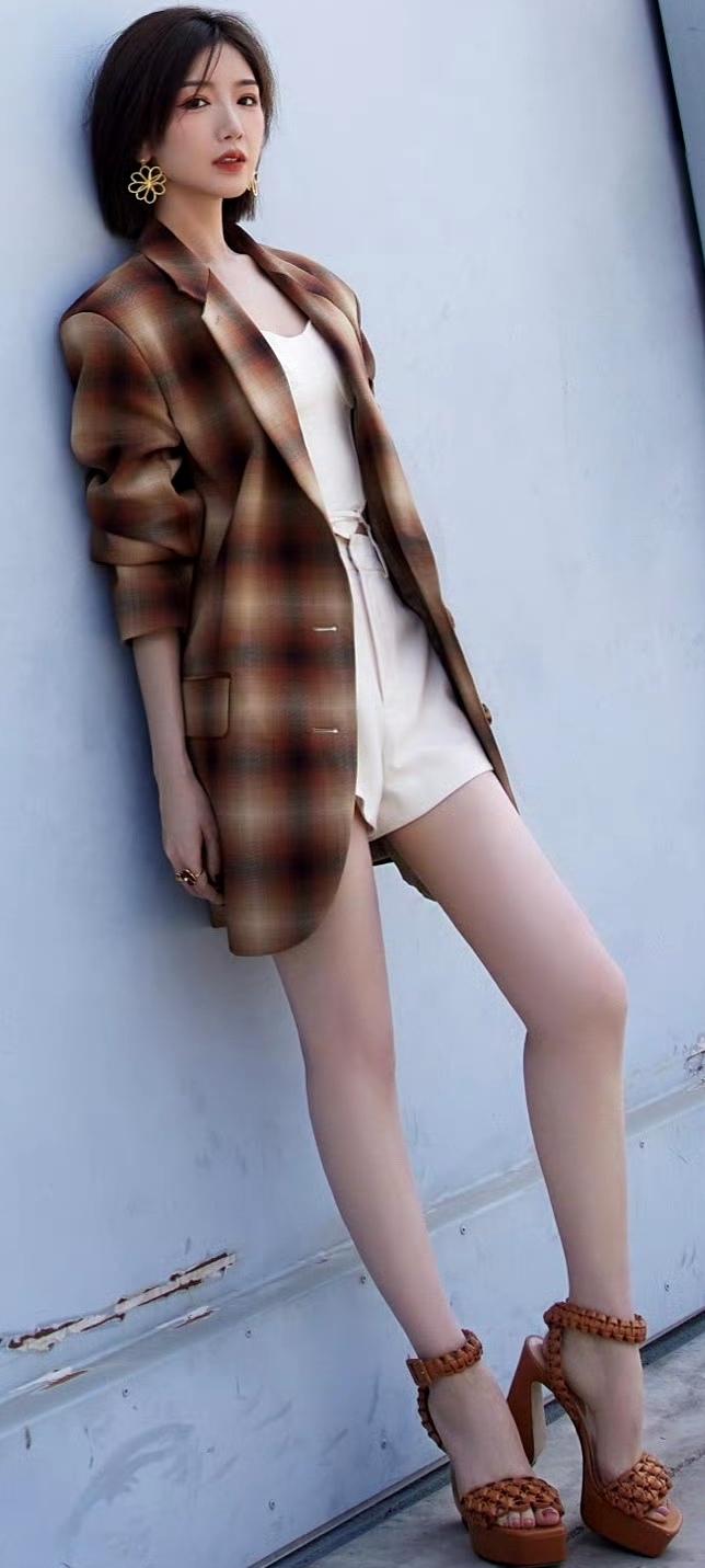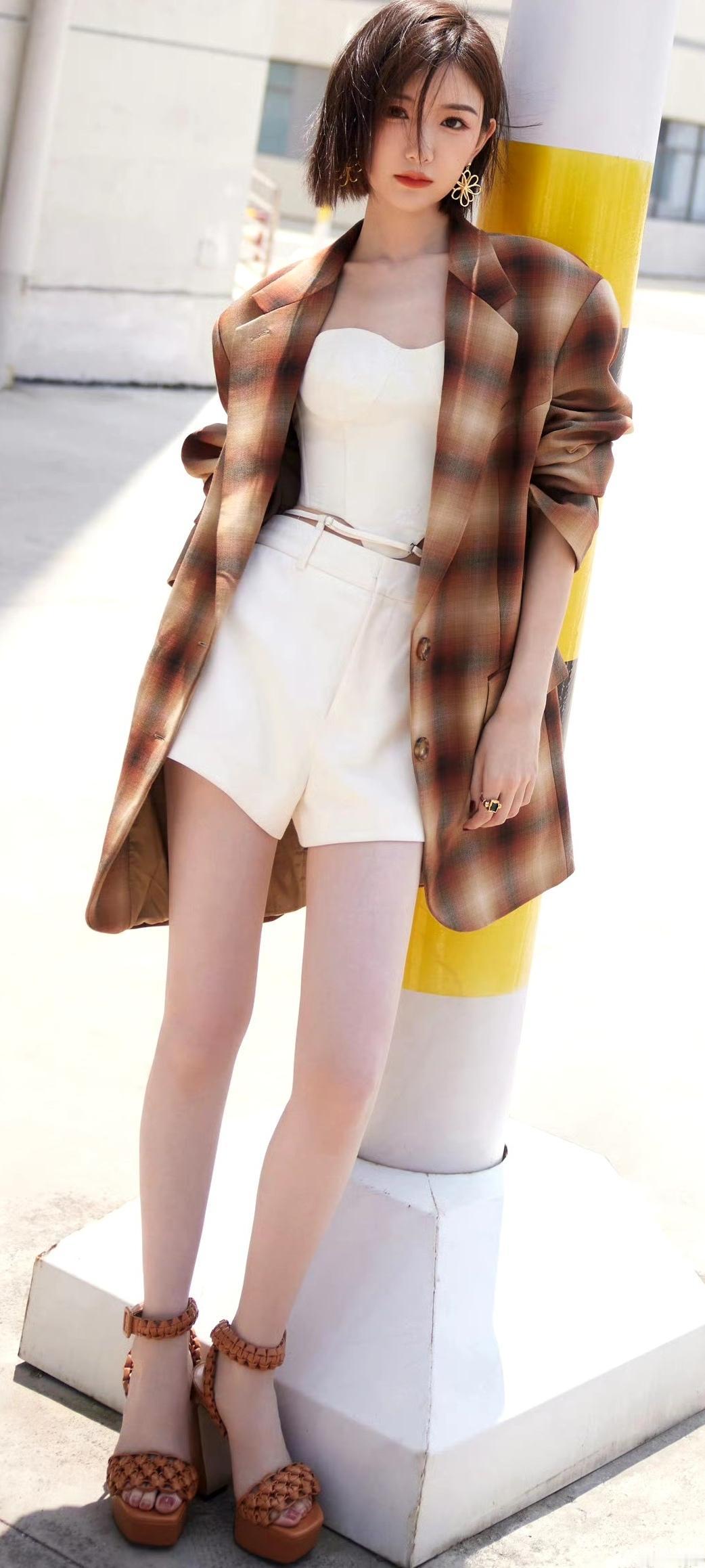 毛晓彤穿格子外套配短裤,好时髦哦!