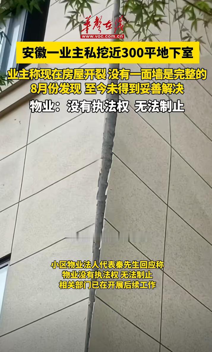 太炸裂了!一业主私自挖300平地下室,导致整栋楼32户人家房屋开裂!这是什么脑回路啊,太无知了,商品房下挖地下室,这下整栋楼都是危房了,他这是倾家荡产也赔不起啊。 8月份开始,安徽六安市霍山县景秀蓝湾多名业主发视频说一业主私自挖300多平的地下室,导致他们32户人家的房屋都开裂,有直的,有八字形的,反正什么形状的开裂都有。顶楼9楼的住户说她家已经没有一面墙是完整的了。 这个业主白天用挖掘机挖,晚上就偷偷将土运出去。这操作也太无知了。 现在这栋楼业主都不敢住了,挖地下室的业主给每家每户出了10天的在外住宿费,(每人每天150),然后烂摊子就不管了。 物业也推卸责任,说他们没有执法权,现在已经上报住建局了。这事物业也有责任啊,谁让你执法了?物业不会阻拦挖掘机进场,泥土装运吗?不会每天巡逻看到开挖就制止吗?报警不会吗? 目前当地住建局已经注意到此事了。应该会有一个解决方案。 感觉这32户人家的房子是保不住了,这个房子四面八方开裂,危房了,这个挖的人估计也赔不起啊,32套房子,一套房子怎么着也要七八十万吧,亿万富豪都赔不起啊。 很好奇这个挖地下室的业主得无知到什么程度啊,还有敢给他的挖掘机司机也很胆大啊,还有挖了那么久物业也没有发现且及时制止吗?太魔幻了。