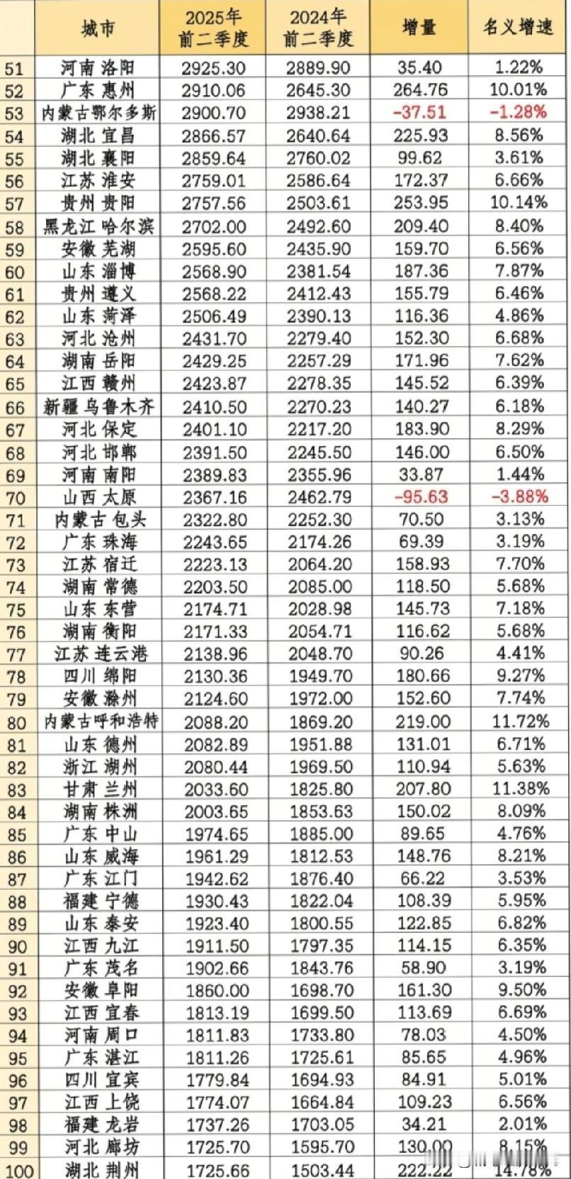 2025年上半年中国大陆GDP百强城市经济发展表现水平情况,图片里属于2025年上半年中国大陆百强城市经济数据,上半年全国GDP百强城市仅有两个城市经济略微有所负增长,其他大部分百强城市经济都能够保持正增长,所以经济出现负增长的两个城市需要努力加油了,上半年大部分百强城市经济发展表现还是很不错的,相信下半年大部分GDP百强城市经济将会继续保持正增长,今年中国大陆大部分GDP百强城市经济都将会比去年发展的更加强大。