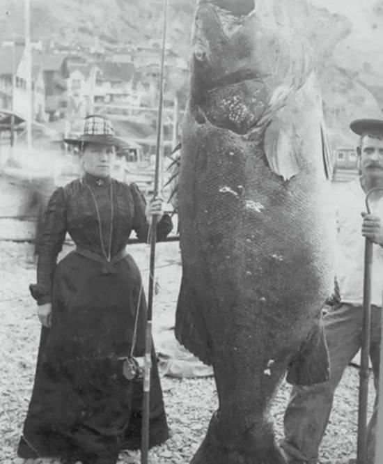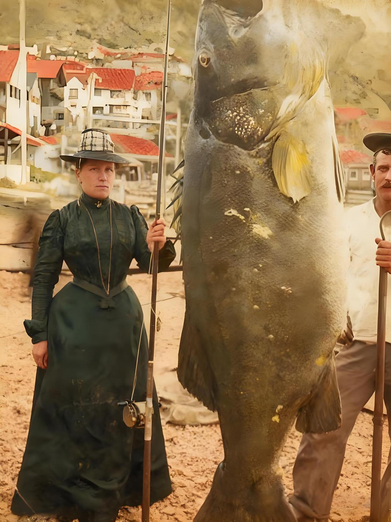 这张拍摄于1901年的照片,巴雷特夫夫人身着黑色维多利亚风格长裙,搭配宽边帽,手持钓竿,神态从容地站在一尾巨鲈旁——这尾条纹锯鮨(俗称“美洲黑石斑”,归为鲈鱼目)重达188公斤、体长2.3米,躯体粗壮得几乎与夫人等高,深褐的鳞片在光影下泛着粗糙的质感,大张的鱼嘴仿佛仍在无声诉说着深海的力量。 她右侧的吉姆·加德纳是位水手,身着工装裤,头戴水手帽,手持工具,作为助手的他,姿态干练,与巴雷特夫夫人一同衬托出巨鱼的震撼体量。在女性鲜少涉足专业垂钓的年代,巴雷特夫夫人的这次收获堪称轰动——这尾巨鲈不仅创下了当时的垂钓纪录,更打破了性别与职业的刻板印象,也为早期垂钓史留下了一抹极具张力的女性色彩。
