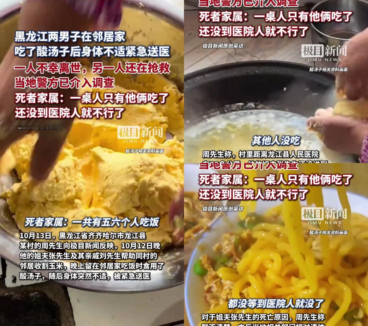黑龙江俩大哥,昨天帮邻居割玉米,晚上留家吃饭,一桌五六个人,就他俩吃了酸汤子。 结果往医院赶的路上,30多公里还没到,其中一个就不行了,另一个还在ICU抢救。 酸汤子是东北老发酵玉米面食,得现做现吃!放久了长黄曲霉素,那是能要人命的强致癌物! 信息来源:极目新闻 网友评论: 以前也听过吃酸汤子中毒的,对于容易出现问题的食物,还是慎重吧。东北还有种叫猪拱嘴蘑的野生菌也是,吃一顿不能吃太多,而且吃只可以吃一顿,(不能下顿还吃)否则也会中毒,那也有人会采了吃。食物种类那么多那么充裕,干嘛要冒险嘞? 我们那是用新鲜玉米打碎,发酵两天变酸,就可以煮粥吃了,从小吃到大。现在在外面吃不到了 小时候没少吃那个了面做的烙单饼,不爱吃面汤。不过没中过毒。感谢我妈的细心。也听说有人吃那个东西中毒,说是阴雨天发霉导致中毒。 我咋记得上次酸汤子出事也是黑龙江的呢?辽宁的极少吃这个。