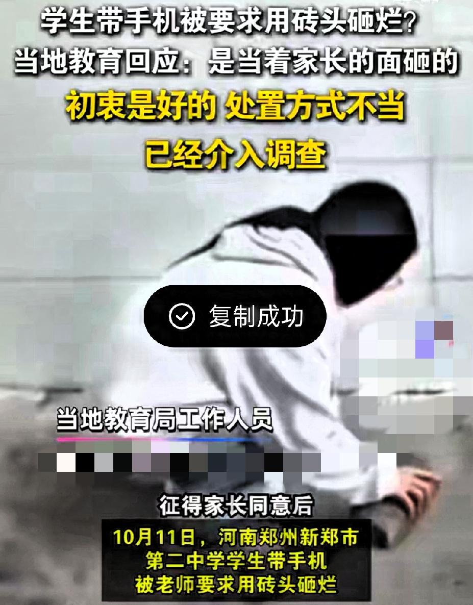 郑州一中学生带手机入校,老师要求其用砖头砸毁,家长站身后强调用点力,当地教育局: