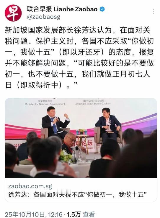 又来找存在感? 新加坡国家发展部长徐芳达表示:在面对关税问题和保护主义时,各国不应采取你做初一,我做十五的态度,报复并不能够解决问题!看到这样的话,就想起印度甘地的话语,敌人来侵略,你就不要反抗,你就在原地坐着,让侵略者来杀,最终侵略者杀累了,也就不杀了! 徐芳达的意思就是说,美国可以对别的国家发起贸易战,但是别的国家不能反击美国,这是什么言论,简直逆天。如果说句不好听的话,如果美国对新加坡展开贸易制裁,而新加坡是不是就不能反击美国?美国做了初一,新加坡不能做十五,是不是这么个意思? 这些人屁股坐在美国那边,反而过来指责受害方,坡县那么小的地方,也敢出来说话,谁给的勇气呢?如果不是一个马六甲海峡,新加坡哪有今天的发展。按照徐芳达的意思,就是说别人砍了他一刀,那么他就受着,一点都不反击吗? 如果是这么操作的话,这世界就好办了。美国可以随时随地的对全世界国家展开制裁,然后被制裁的国家,全都不反抗,任由美国称霸全球? 新加坡从1965年建国那一天起,就与美国绑定在一起,时时刻刻地唯美国马首是瞻。现在新加坡仗着美国还有实力,所以还可以左蹦右跳。但是以后美国实力不行了,请问新加坡要抱哪个大腿?
