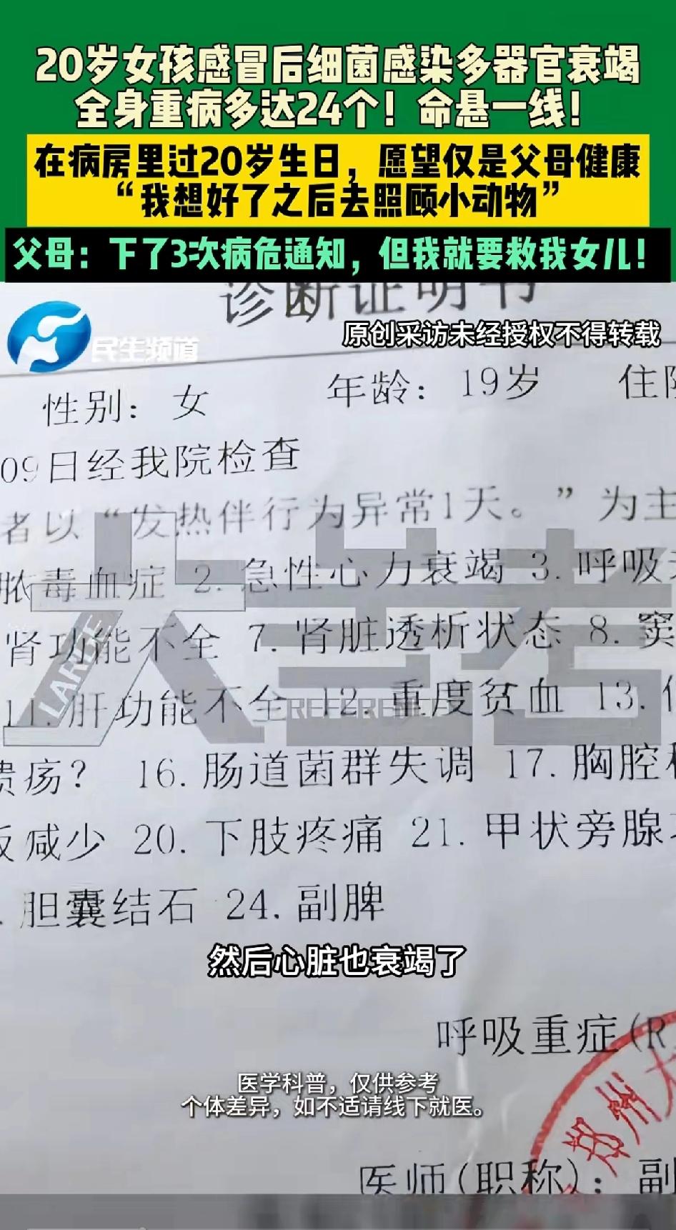 20岁女孩感冒后细菌感染多器官衰竭 全身重病多达24种!命悬一线! 郑州20岁女大学生小文,临近期末连续熬夜复习,染上流感。她起初以为是普通小感冒,就在宿舍躺了两天,结果病情恶化。到省中医院检查,肺部已有感染,住院不到半天就呼吸衰竭。 在病房里过的20岁生日,愿望仅希望父母身体健康,“想好了之后去照顾小动物”。 父母:下了三次病危通知书,肺全部白了,心脏也衰竭了,肝也不好,母亲边说边泣不成声! 父亲:每天到楼道里哭,不敢大声,怕别人听到笑话自己。 夫妻两人太崩溃了!本来一个小感冒,一连下了3次病危通知书,没想到这么严重快要了女儿的性命了! 她在ICU抢救了21天,全身重病多达24种,命悬一线。这给大家敲响警钟,别小瞧感冒,尤其是在过度劳累、身体免疫力下降时。有不舒服千万别硬扛,及时就医才是对自己负责。 不知道是不是急性肺炎导致的? 朋友过年期间感冒了,去诊所拿两天药,药还没喝完,病情就加重了。 整个人发烧呼吸困难,赶紧送到医院 诊断出肺炎,在医院住了12天,每天输水!亲眼看到旁边病友因肺炎离世 朋友说自己很庆幸,及时去医院了,要不及时去医院自己也会死! 我看到朋友时已经出院了,整个人浮肿憔悴,大病初愈的状态! 从那以后我才知道肺炎这么厉害! 医学再怎么发达!也不要小瞧肺炎!