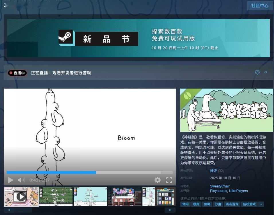猎奇“鹅树”养成游戏《神经鹅》免费试玩Demo已上线Steam,支持中文,已好评,本作将于今年第四季度正式发售。试玩Demo目前提供前三关的试玩,10月17日更新第四关。