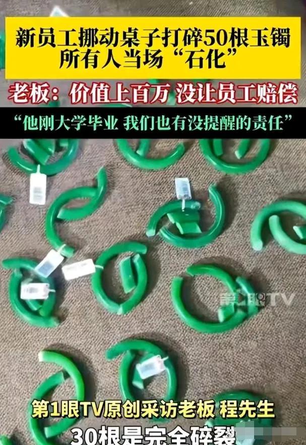 苏州00后店员摔碎百万玉镯!老板一句话,全网赞爆 苏州玉器店的监控里,刚毕业的新店员搬桌子时,“哗啦”一声让全场僵住——桌缝里藏的一盘玉镯全砸在硬地上,碎渣溅了满地。 等大家缓过神来清点,心彻底沉了:50只玉镯碎了30只,和田碧玉混着白玉,总价值超百万。新店员脸瞬间惨白,攥着衣角说不出话,刚出校门的他,连稳定收入都没有,这钱把他卖了也赔不起。 这事本是“大事故”:老板程先生让他搬桌,却没提前说桌上有贵重玉器;新店没铺地毯,连基础防护都没做;年轻人没经验,根本没注意到桌缝里的“隐患”。责任掰扯起来,店里占了大半。 可让人没想到的是,程先生看清损失后,没发火也没提赔偿,只让大家一起收拾碎片。他当着所有人的面说:“不用赔,损失我担。”还拍了拍新店员的肩:“就当买个教训,以后做事多留意细节。” 后来有人问他为啥这么做,程先生的话很实在:“怪他有啥用?他赔不起,我也不想让刚出社会的孩子,被百万债务逼到绝路。” 没把管理疏忽甩锅给新人,没让一场意外变成年轻人的“职场噩梦”,这位老板的清醒和善意,比那百万玉镯更珍贵。