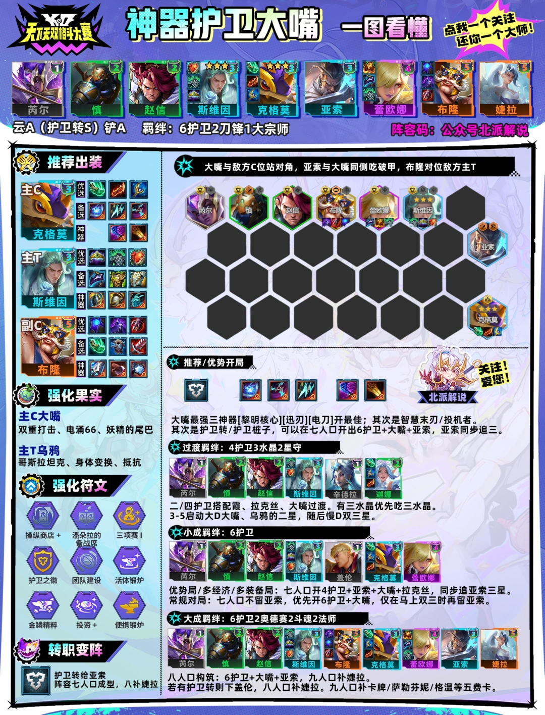 在宝可梦经验机制改版后,大嘴不再需要来的早才能玩。定阵前提更偏向于装备:神器开局拿到【黎明核心】【电刀】【迅刃】都可以无脑冲。另外一个上限较高的定阵方式是【护卫转】亚索/护卫桩子,这样可以在七人口启动时保留亚索同步追三,多养一个C位。