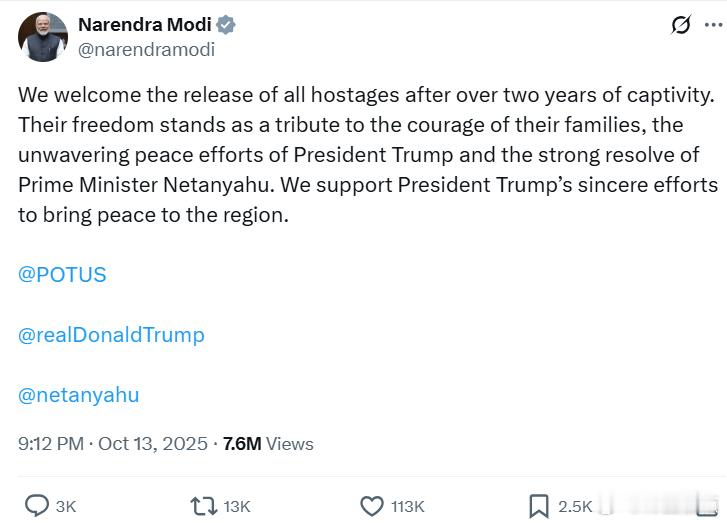 我们欢迎所有人质在被关押两年多后获释。他们的自由是对家属勇气、特朗普总统坚持不懈的和平努力以及内塔尼亚胡总理坚定决心的致敬。我们枝持特朗普总统为该地区带来和平所做的真诚努力。