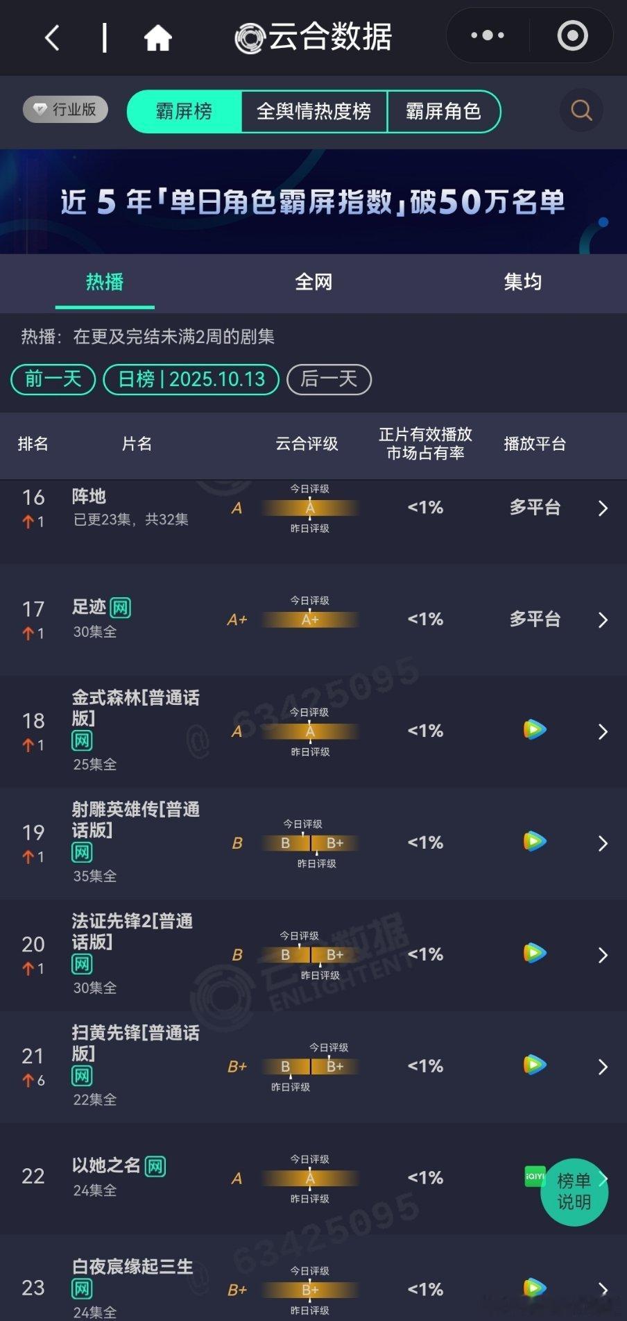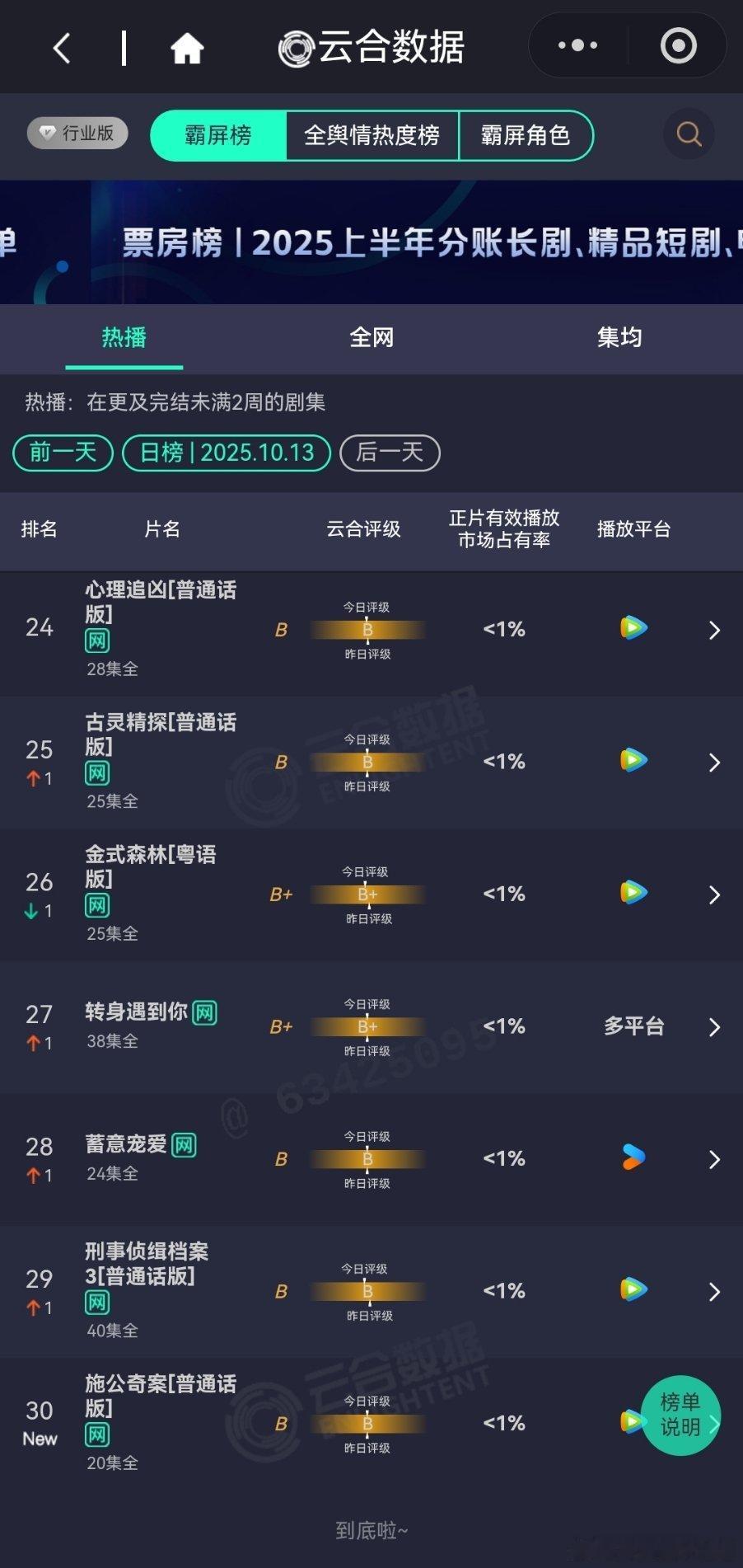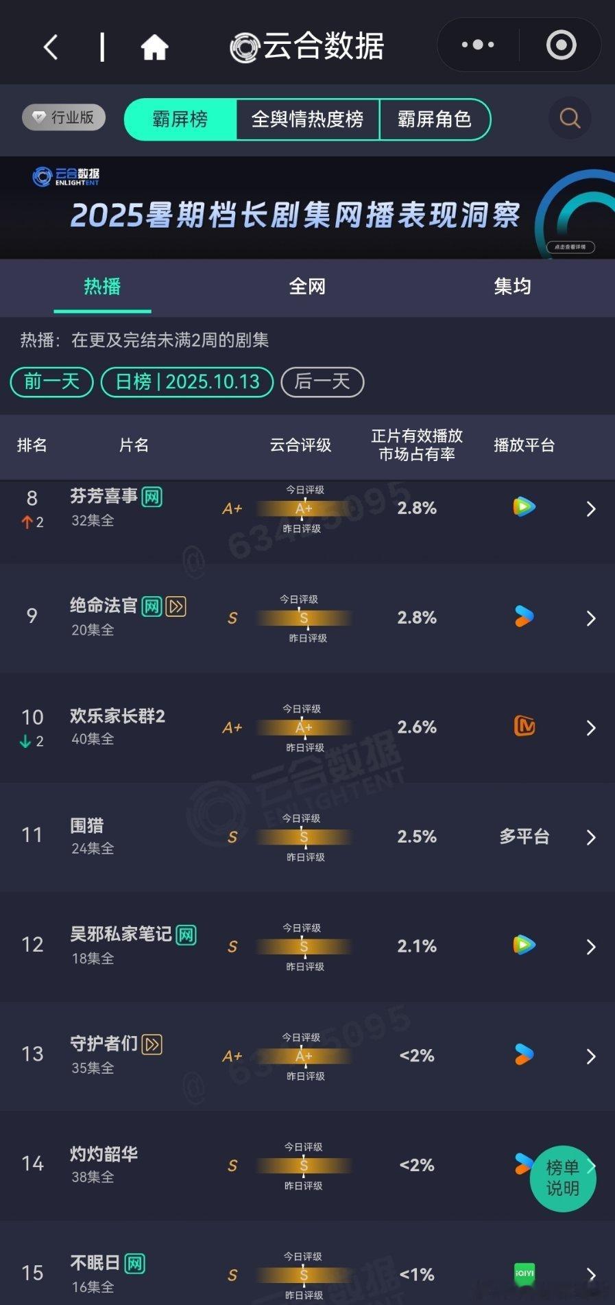 10月13日云合播放占比云合