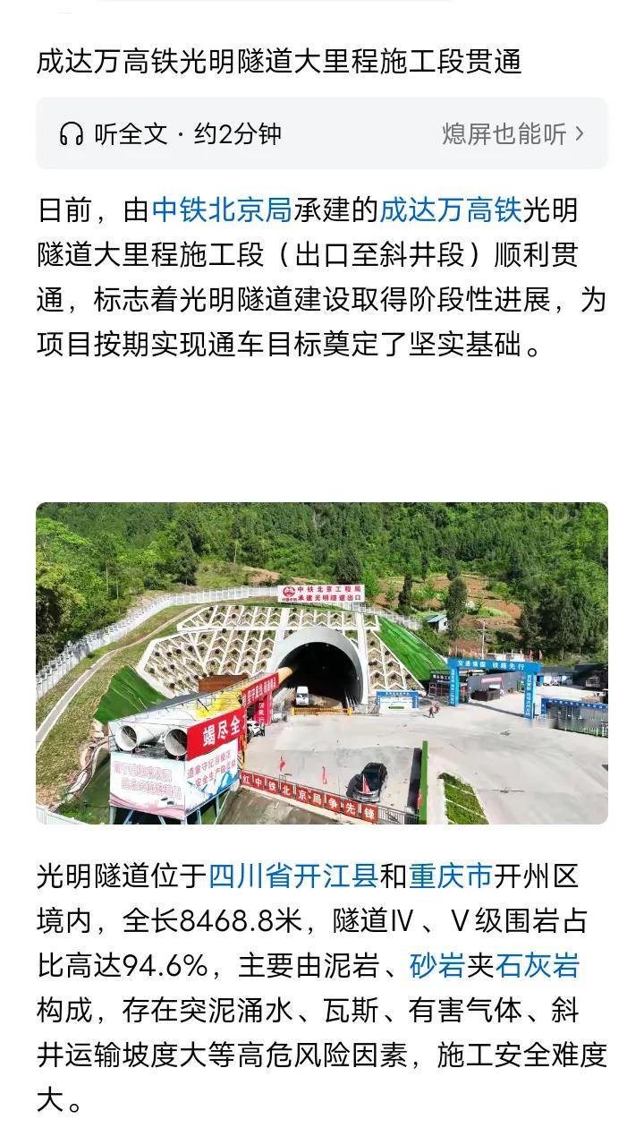 重大进展,成都途经达州至万州时速350公里的成达万高铁遂宁涪江特大桥已于今天顺利合龙(图一),控制性工程南充嘉陵江特大桥正在全速建设中,全长8.4公里的光明隧道(出口至斜井)顺利贯通,预计2027年全线开通运营,届时遂宁和南充还有达州等川东北城市区县将结束不通时速350公里高铁的历史,万州坐高铁来往成都将只需不到2小时,达州坐高铁来往成都只需1.5小时左右,未来达州南站和万州站将成为重要的高铁枢纽站,沿途的开江、渠县、营山、蓬安等地也将融入国家八纵八横高铁网。