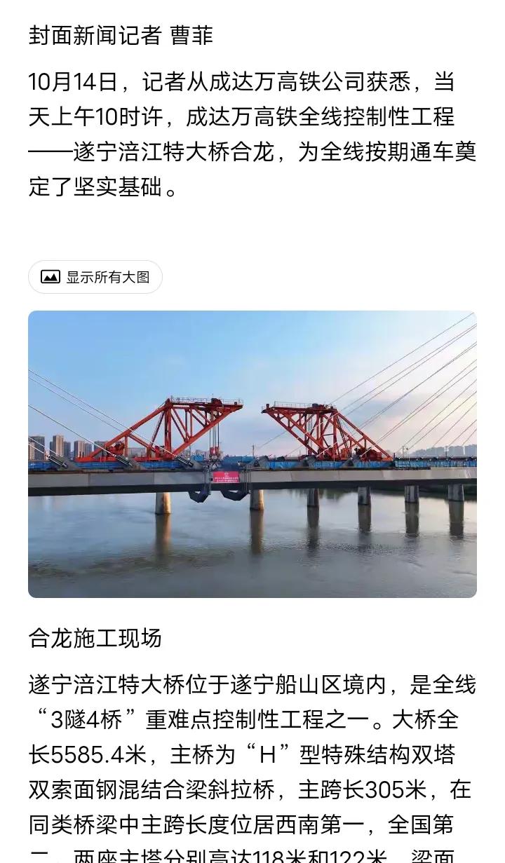 重大进展,成都途经达州至万州时速350公里的成达万高铁遂宁涪江特大桥已于今天顺利