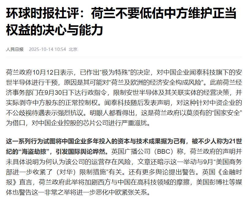 荷兰不要低估我们维护正当权益的决心与能力! 就在10月12日,荷兰政府以“极为特殊”为借口,对中国闻泰科技旗下的安世半导体进行干预,声称这家企业可能威胁到“荷兰及欧洲的经济安全”。 而早在9月30日,荷兰经济事务部门就已经下了行政指令,限制安世半导体及其关联实体的经营决策,实际上把中方股东的正常控制权给剥夺了。 这种没有任何事实依据的指控,说白了就是拿“国家安全”当幌子,行贸易保护之实,这严重违背了市场经济的基本规则,也破坏了国际经贸的正常秩序。 大家都清楚,安世半导体就是一家正常做生意的企业,它的经营活动一直都遵守当地的法律法规,在全球半导体产业链里也是合法合规地开展业务。 荷兰政府仅凭自己的主观猜测,就对企业的正常经营指手画脚,这种做法不光损害了中国企业的合法权益,更会砸了荷兰自己的招牌——毕竟哪个企业还敢去一个随意干预正常经营的地方投资呢? 而从两国合作的大背景来看,长期以来中荷在经贸领域的合作一直不错,荷兰是中国在欧盟的重要贸易伙伴,双方在科技、制造等很多领域都有互利共赢的合作。 公开数据显示,中荷贸易额常年都很高,不少荷兰企业在中国市场赚得盆满钵满,中国企业去荷兰投资也给当地带来了不少就业岗位,推动了经济增长。 现在荷兰政府这么一搞,好好的合作局面被打破,最后受损的肯定是双方的共同利益。 我们一直都坚定地维护本国企业的正当权益,不管哪个国家要是用不正当理由骚扰中国企业,我们绝对不会不管不问。中国商务部已经多次强调,会采取一切必要的措施,坚决保护中国企业的合法权益不受侵害。 现在全球化已经发展到很深的程度,各国企业之间相互依赖、互利共赢是大趋势,动不动就拿“国家安全”当理由设置贸易壁垒、限制企业经营,这种逆全球化的做法早就没人支持了。 以前国际上也有不少类似的例子,有些国家借着安全的名义搞保护主义,最后不光没起到“保护”的作用,反而让自己国内的市场活力下降,国际合作也受到了阻碍,完全是得不偿失。 荷兰政府真该好好醒醒了,中国企业能发展壮大,靠的是市场竞争的实力,而且中国企业也是全球产业链供应链稳定的重要力量。想通过非正常手段来遏制中国企业,不光是不把市场规律放在眼里,更是在破坏中荷友好合作的基础。 我们劝荷兰政府停止错误的做法,纠正之前的决定,别再对中国企业进行无端骚扰,回到好好对话协商的正确道路上来。 中国维护自身正当权益的决心和能力,绝对不容低估,任何想挑战中国底线的行为,最后定会自食苦果。