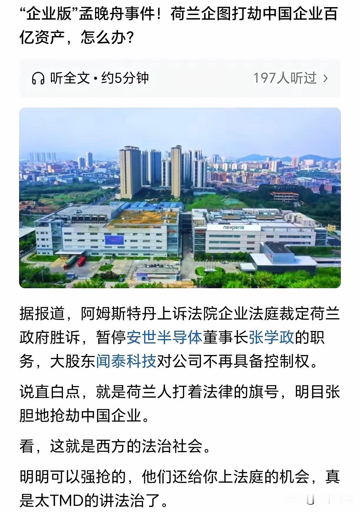 安世半导体事件,说明了许多中国企业的外籍高管都是潜在的叛徒,关键时刻倒戈一击就可以让一家企业万劫不复。外敌容易防,内鬼难防。 荷兰那片土地上,一场精心策划的夺权大戏刚刚落幕。安世半导体,这家被中资收购后五年缴税1.3亿欧元、从亏损做到零负债的优质企业,在短短七天内被剥夺了控制权。闪电战的节奏快得让人窒息——9月30日荷兰政府发布冻结令,24小时内三位外籍高管联手“逼宫”,10月7日法院已任命拥有“决定性投票权”的外籍董事。 企业战场上,信任成了最昂贵的奢侈品。当安世半导体的荷兰籍法务官、德国籍CFO和COO集体倒戈,我们看到的是一场里应外合的完美风暴。这些身着西装的高管不再是单纯的职业经理人,他们成了政治博弈中的特洛伊木马。 半导体产业的竞争早已超越了商业范畴。安世在功率分立器件领域全球第三,它的价值不仅在于利润,更在于它卡住了某些国家的战略咽喉。当商业规则被政治操弄撕碎,所谓的“国家安全”就成了最方便的遮羞布。 闻泰科技的遭遇绝非孤例。数据显示,2022年中国对欧洲直接投资已降至十年最低点,高科技领域的并购正遭遇系统性围猎。每个出海的中国企业都不得不面对这样一个现实:你的外籍团队,可能既是合作伙伴,也是潜在的安全漏洞。 内鬼之所以难防,因为他们总是戴着友善的面具。那位德国籍CFO可能昨天还在向你汇报业绩,今天就向法庭提交了剥夺你控制权的申请。这种背叛不是临时起意,而是一场精心布局的合谋。 伤痛教会我们什么?是时候重新审视全球化了。不是要关上大门,而是要装上安全锁。建立信息分级管理、设置权限矩阵、引入区块链存证技术——这些不再是大企业的可选配置,而是出海企业的生存必需品。 中国半导体行业在前10个月出口增长21.4%,这条逆势增长的曲线告诉我们:真正的安全阀,永远掌握在自己手中。当别人的庭院不再安全,我们就必须把自己的庭院筑得更牢。 各位读者你们怎么看?欢迎在评论区讨论。 全球半导体行业 欧洲芯片公司