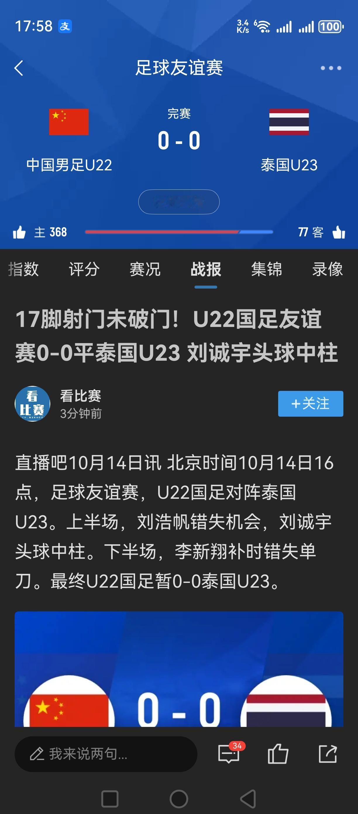 泰国队U23也不是鱼腩!0:0逼平中国U22! 全场中国队整体占优!射门18:8!射正8:1!刘诚宇头球中柱!李新翔单刀没进!但泰国队反击也犀利,还进了一个越位球! 中国队下半场换上王珏栋和蒯纪闻后,比上半场进攻犀利!不过门前终结能力确实有待提高!另外防守也有问题! 两场与泰国队的热身结束! 一场3:1,一场0:0! 总体来说,热身赛强度还可以,阵容也演练了,问题也发现了! 接下来该看正式比赛的结果了!