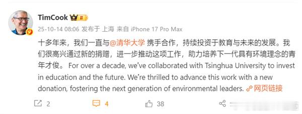 苹果再向清华捐赠10月14日,苹果官网发布公告宣布,向清华大学启动一项新的捐赠计