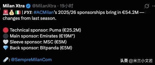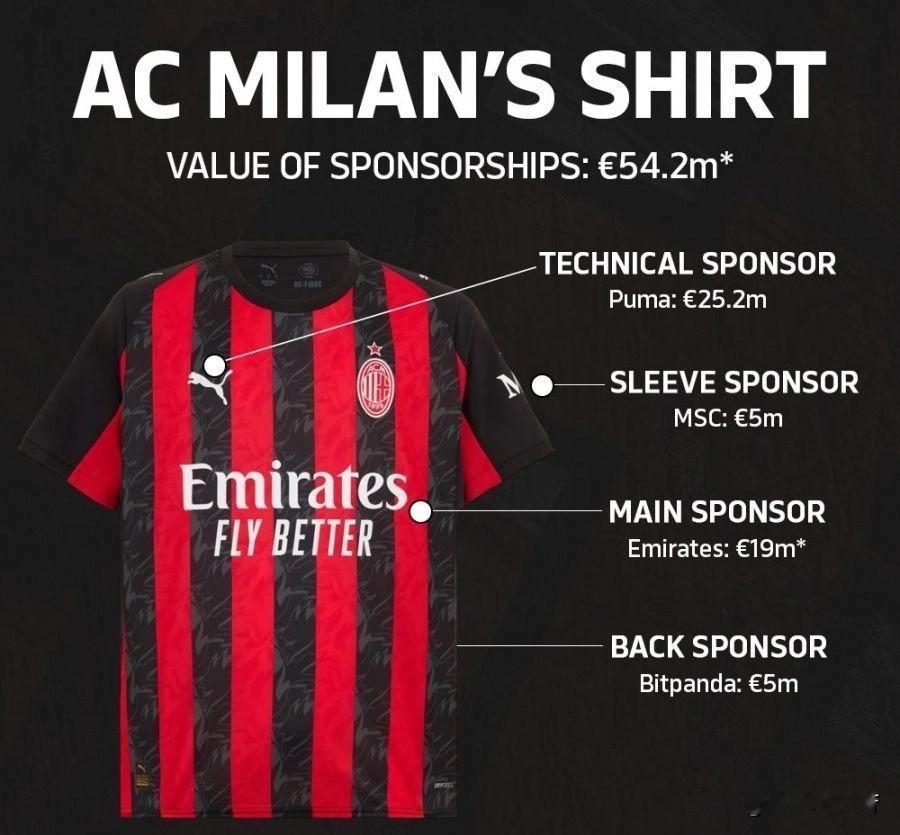 米兰本赛季赞助费收入为5420万欧元,本赛季赞助费收益与上赛季持平。因为欧冠原因阿联酋航空的赞助费又减少了差不多200万欧元,米兰现在也不知道为啥混成这个样子,阿迪达斯不把米兰当回事,给的还没彪马多,阿联酋航空更是可笑,给的还没阿森纳多,我没有不尊重阿森纳的意思,但一个豪门开会只能在院里嗑瓜子的球队人家商业到底怎么开发的。 其中一级赞助费为: 技术赞助商:彪马(2520万欧元) 主赞助商:阿联酋航空(1900万欧元) 袖标赞助商:MSC地中海航运公司(500万欧元) 背部赞助商:Bitpanda(500万欧元) 米兰刚刚公布的上赛季收益为米兰历史第一,只有4.95亿欧元,皇家马德里俱乐部12亿多,米兰损失了20年,我们20年前与皇家马德里俱乐部收益差不多,欧冠数也没差多少,20过去了,欧冠数领先我们一倍,收益快三倍了,我们损失了20年时间。