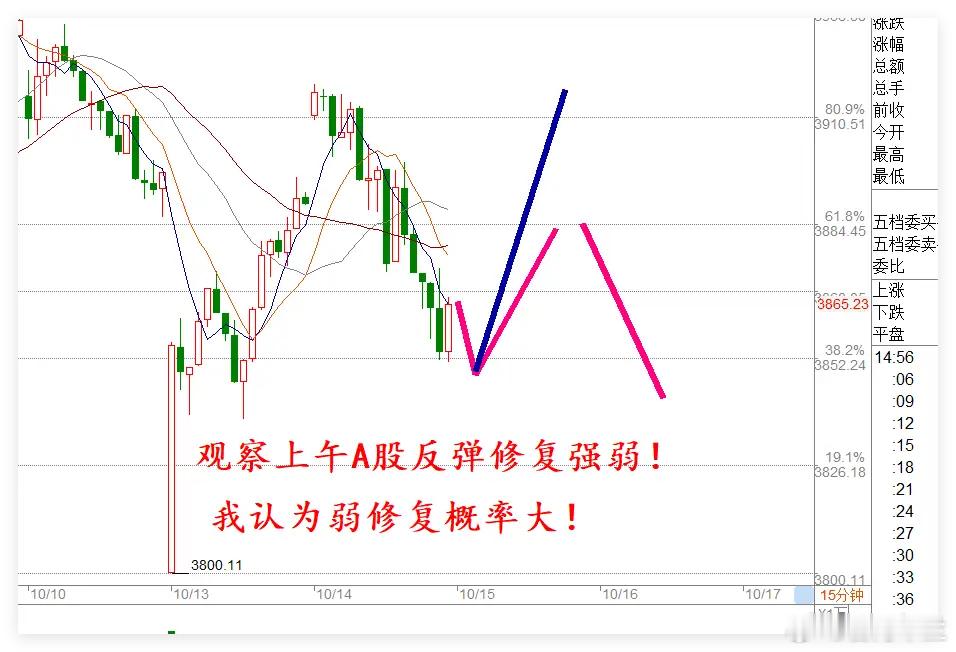 关于10月15日A股走势,我的预判如下:市场大概率会迎来修复行情,尤其若早盘出现低开,修复动力或更明显;但需注意,今日下跌过程中成交量已明显放大,因此修复力度有限,很难出现大阳线反弹。