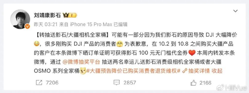 倒是大疆的竞争对手、影石Insta360的创始人兼CEO刘靖康昨日(10月13日)公开对外“致歉”。他称,“可能有一部分因为我们影石的原因导致DJI大幅降价。”“为表歉意”,他将为10月2日至10月8日期间购买大疆产品的用户提供100元影石无门槛代金券。