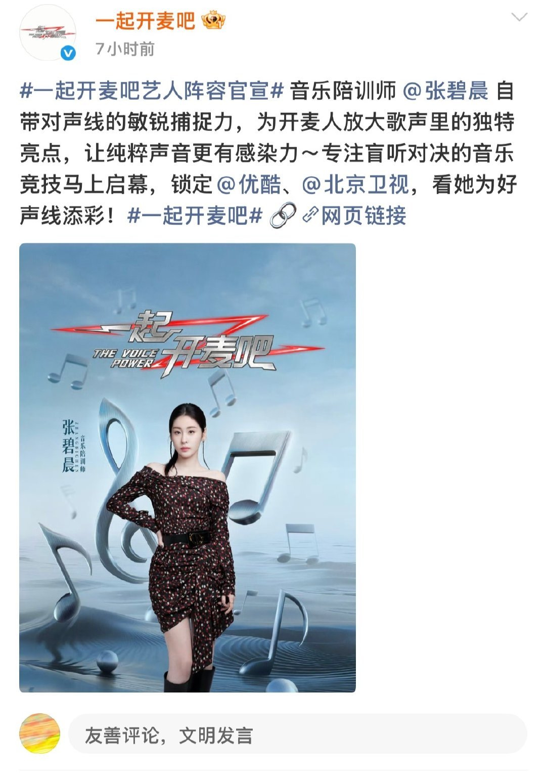 汪苏泷张碧晨音综对打汪苏泷官宣《中国唱将》,张碧晨官宣《一起开麦吧》,两人音综