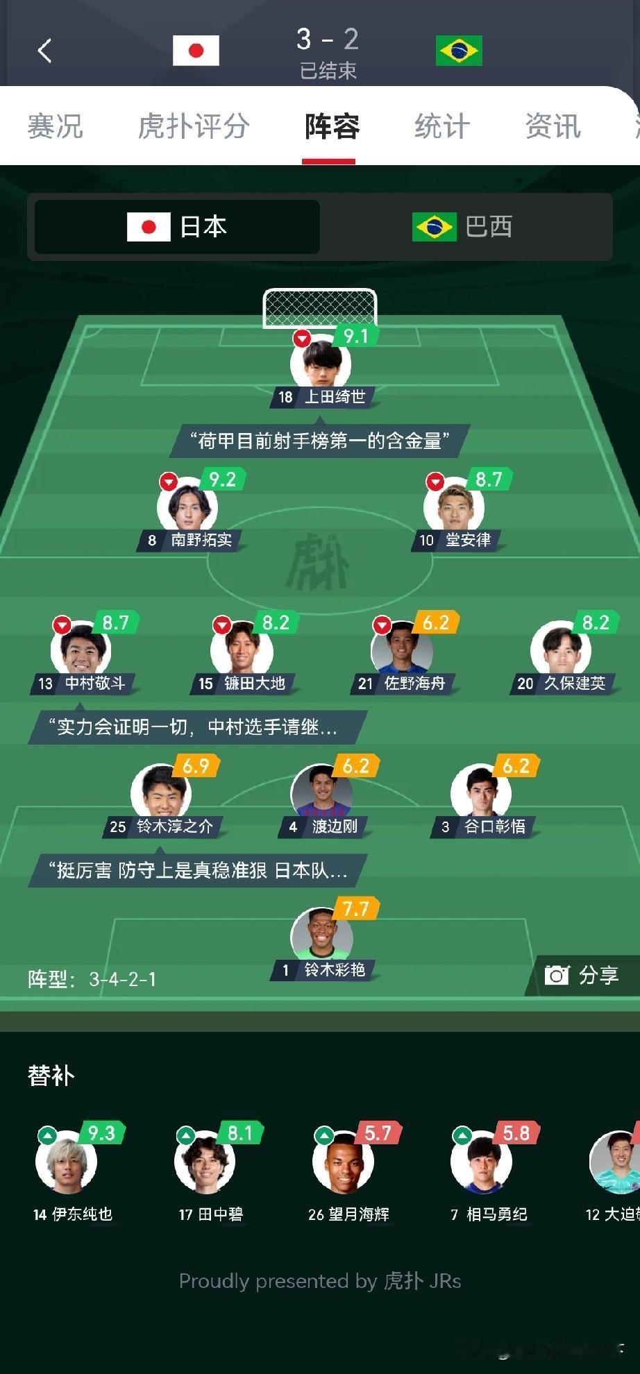 国足平泰国,日本胜巴西,韩国胜巴拉圭。这就是赤裸裸的差距啊! 现在不得不承认:足球方面日韩确实是亚洲之光啊!日韩确实代表了亚洲最高的足球水平。 尤其这小日本踢球确实没得黑,球员技术实在太好了,而且意志品质不是一般的强,咱国足要是有其中一样,也不至于被喷成这样。 说真的,日本足球才是我们最该学习的榜样,人家定的2050年男足拿世界杯冠军,现在看来要提前实现了,日本女足已经提前拿世界杯了。