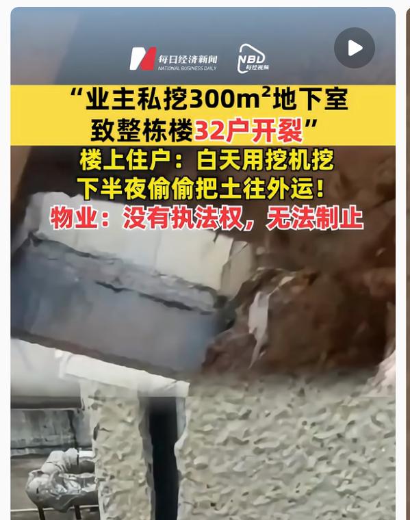私挖地下室的业主突然甩出王炸! 真的没有想到 挖个地下室能闹成整栋楼32户开裂。 白天用挖机轰隆隆挖,下半夜偷偷用卡车运土,3米高的围栏围得严严实实,工人进出还锁门,邻居们愣是没发现动静。顶楼9楼的住户家里墙全裂了,横向纵向八字形的缝到处都是,窗台大理石断了雨水直渗,事儿从8月闹到现在还没解决。 好好的楼说挖就挖,全楼人的安全就这么不当回事儿?