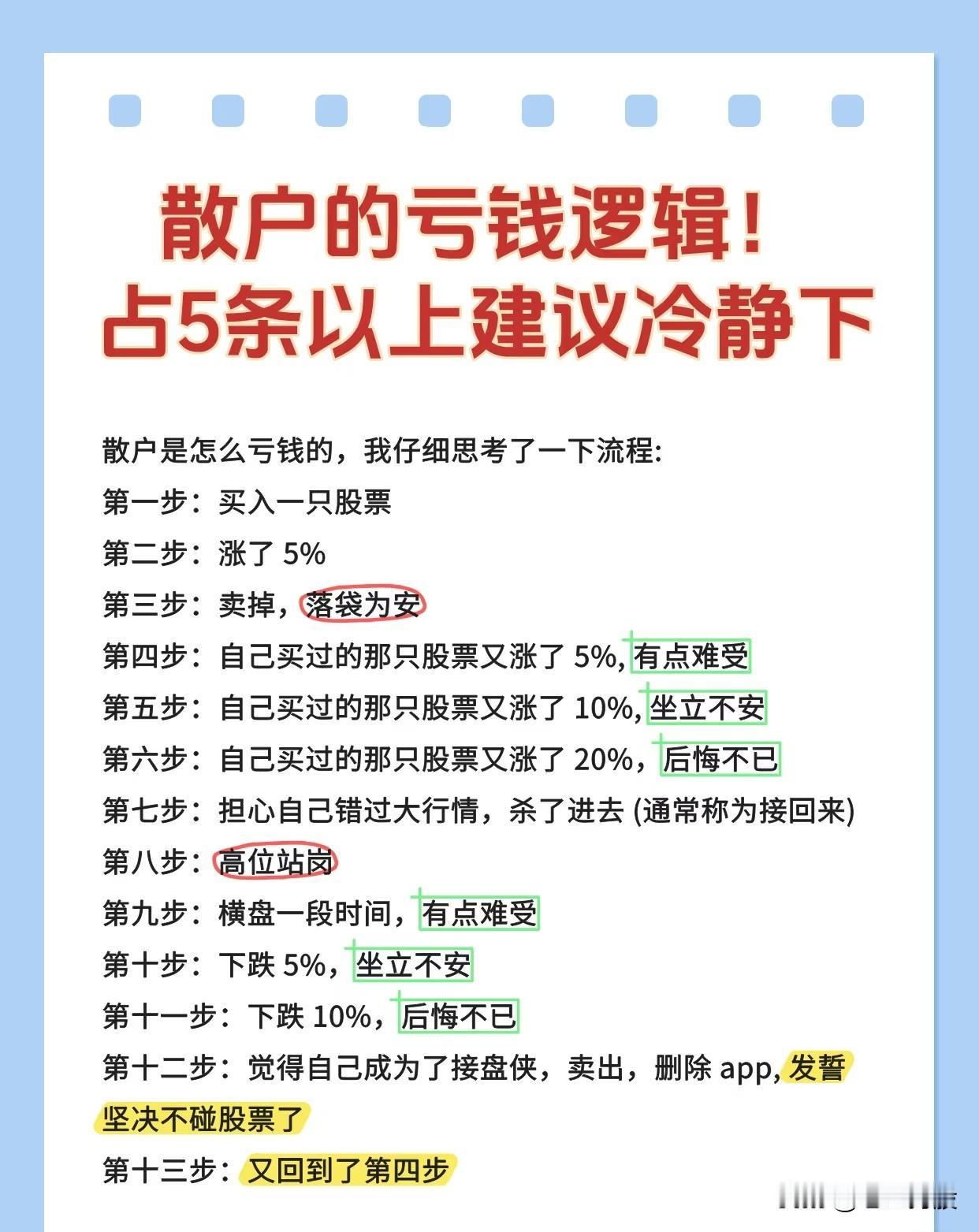 散户在股票投资中容易陷入的亏钱逻辑流程: 1. 初始操作与小额盈利:散户买入股票,涨了5%后选择卖掉,即“落袋为安”。 2. 错失后续上涨与心理变化:卖出后,原股票继续上涨。涨5%时感到“有点难受”,涨10%时“坐立不安”,涨20%时则“后悔不已”。这种持续的上涨不断刺激散户的情绪。 3. 追高进场与被套:由于担心错过更大的行情,散户在较高价位重新买入(俗称“接回来”),结果“高位站岗”。 4. 持仓亏损与负面情绪:买入后股票可能横盘一段时间再次让人“有点难受”,随后开始下跌。下跌5%时“坐立不安”,下跌10%时“后悔不已”。 5. 绝望割肉与发誓远离:散户此时认为自己成了“接盘侠”,于是卖出股票、删除交易APP,并“发誓坚决不碰股票了”。 6. 循环往复:然而,过一段时间后,散户又会回到看到之前卖出的股票再次上涨(即流程中的第四步)的状态,重复这个亏钱的循环。 总结来说,这张图描绘了散户因过早止盈、随后因后悔和害怕踏空而在高位追入,最终被套亏损并誓言远离市场,但往往又重蹈覆辙的完整心理和行为过程。