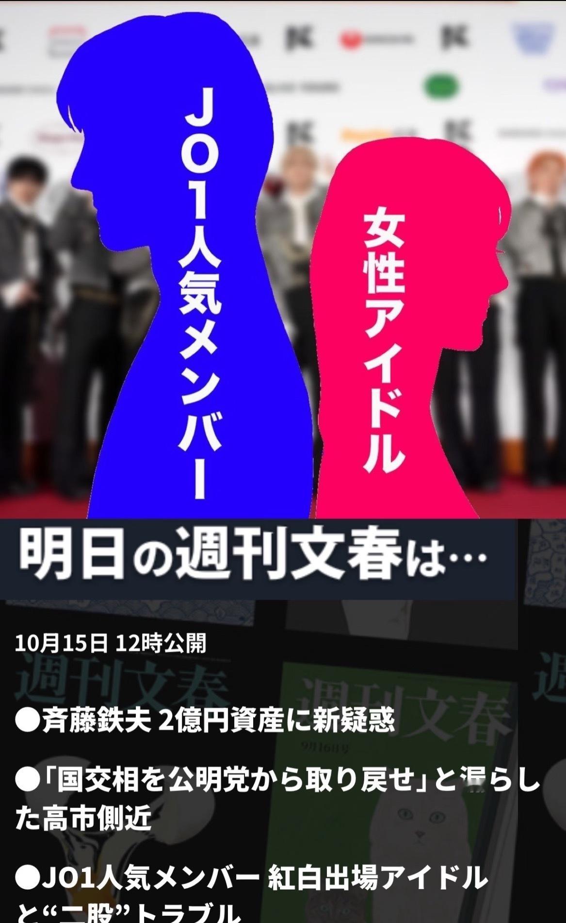 【twi】文春将在明日12点爆料,男团JO1人气成员与曾登上过红白歌会的女偶像的